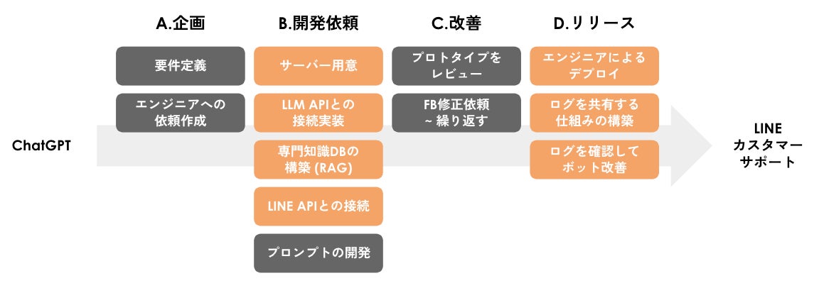 AIプロダクトを開発し公開するまでには下記の例のように様々な工程が発生し、制作期間や費用に大幅なコストがかかってしまうところ、これらの工程をノーコードで構築できる「miibo」の豊富な機能を活用することで、会話型AIプロダクトの本質的な体験開発にフォーカスすることができます。