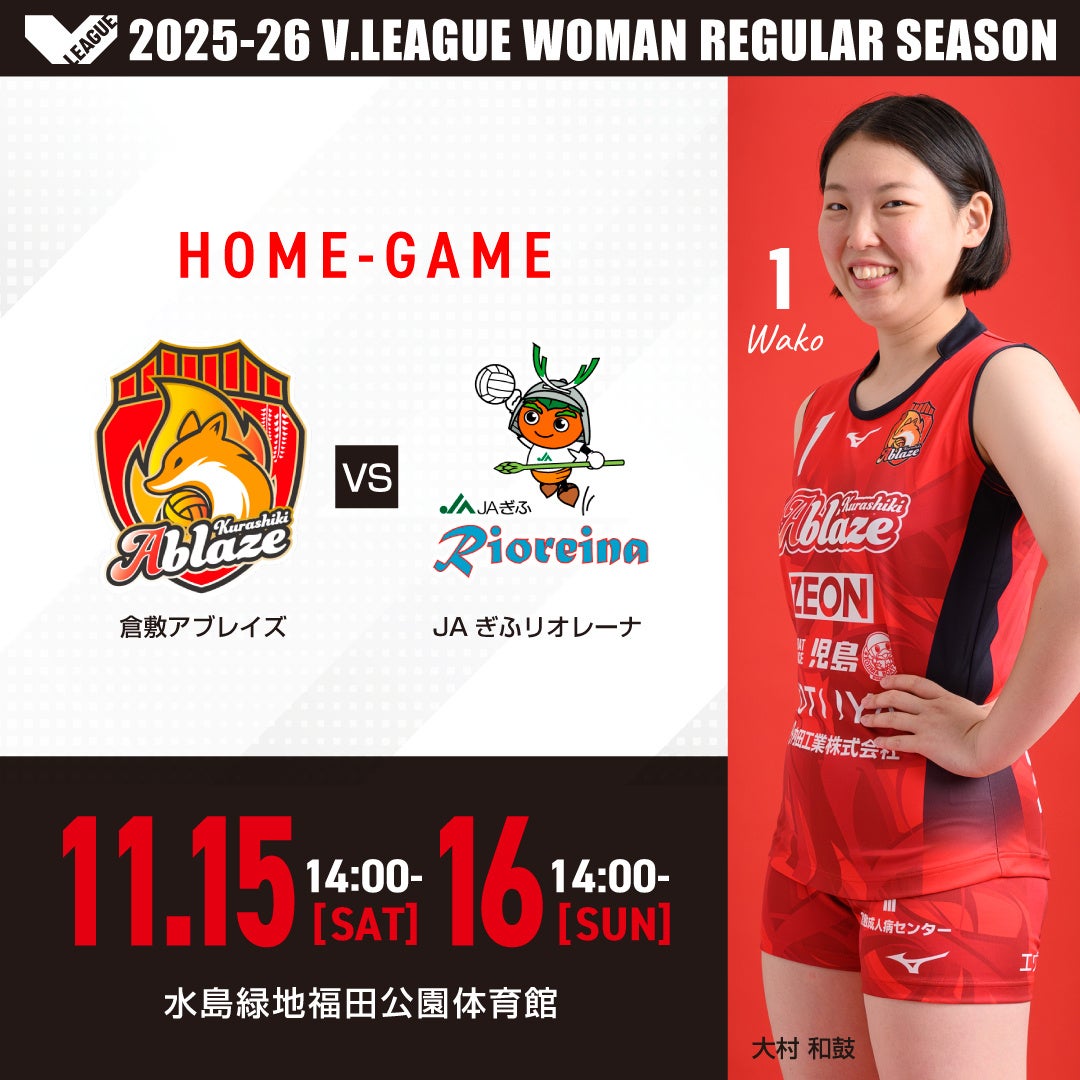 倉敷アブレイズ(Vリーグ/女子)は、11月15日(土)・16日(日)に水島緑地福田公園体育館(倉敷市)にてホーム開幕戦を開催いたします。