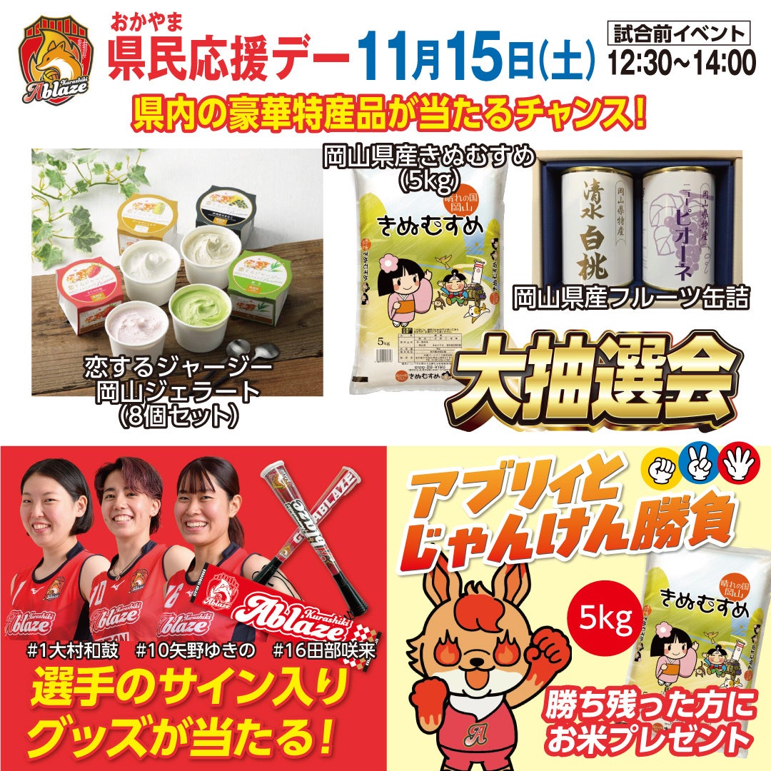 当日は「勝ちT(応援Tシャツ)1,000枚配布」「おかやま県民応援デー(大抽選会/じゃんけん大会)」「市民招待デー」「カスタムTシャツブース」「おかやまスポーツフェスト スタンプラリー」など、イベントが盛りだくさん。家族も、友達も、職場の仲間も!みんなで会場を真っ赤にして、アブレイズを応援しよう!