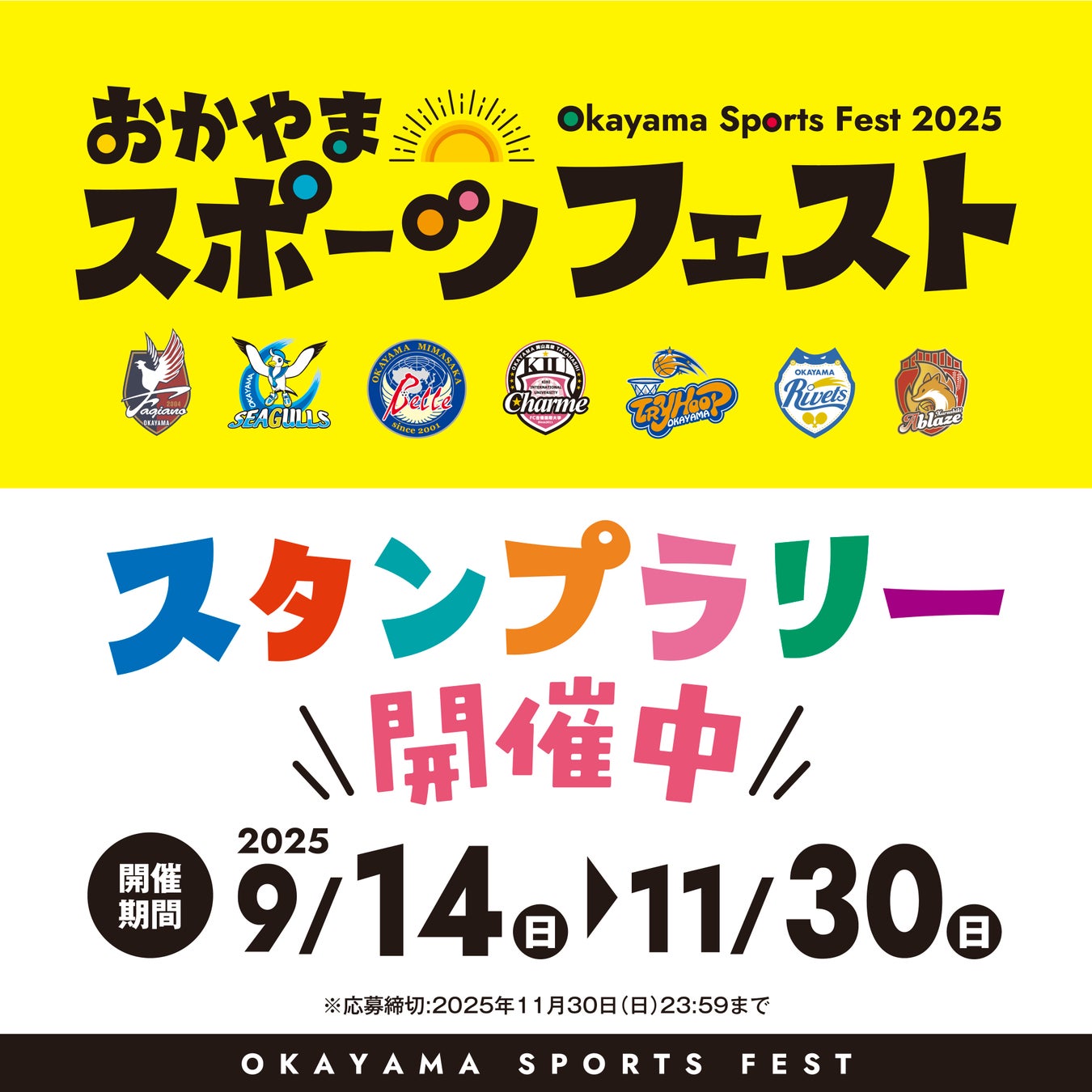2チーム以上の試合会場を巡り、2スタンプ以上を獲得しアンケートに答えると、抽選でサイン入りグッズや岡山名産品が当たります。