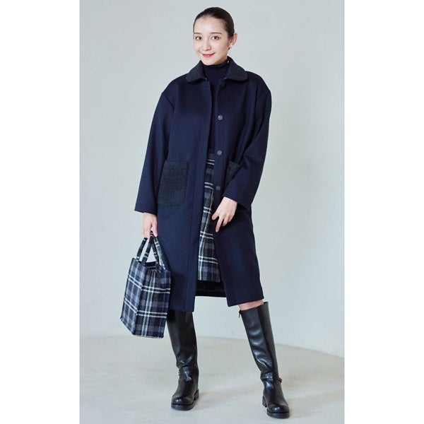 膝がしっかり隠れる上品な丈感のすっきりとしたAラインシルエットのロングコート。メルトン生地よりも軽い着心地で、やわらかな手触りと美しい艶感が特徴のウールビーバー素材を使用。襟とポケットにはループツイードを部分的に使用しており、シンプルながら表情のあるデザインに仕上げました。襟は取り外しも可能で、ノーカラーコートとしてもご着用いただけます。