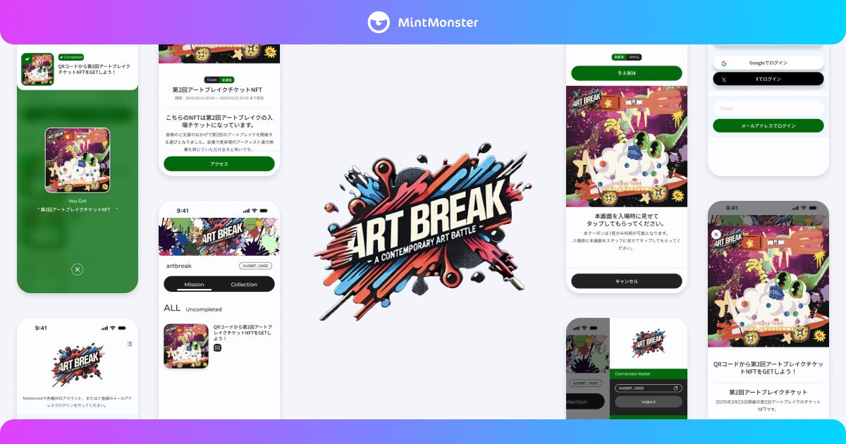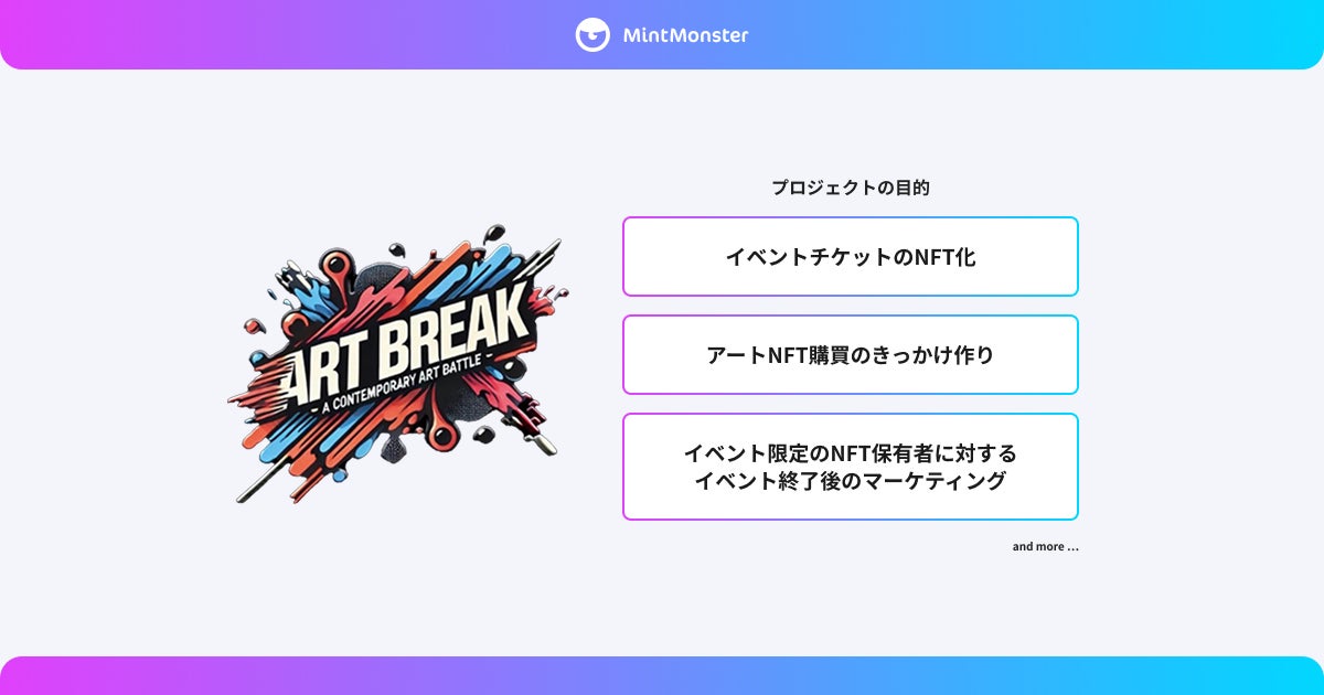 ARTBREAKでは福岡を拠点に現代アーティストを発掘・応援するために幅広い取り組みを行っております。今回、現代アートイベントの「ARTBREAK」のチケットをNFT化するために「MintMonster」を活用しました。本取り組みは、チケットのデジタル化による紛失防止や、イベント参加の記念をを保有してもらうことを目的としています。今回のNFTチケットの導入により、参加者は従来の紙チケットやデジタルQRコードに代わり、ブロックチェーン上に記録されたNFTチケットを保有することが可能となります。これにより、イベント後もチケットを思い出として保管できるだけでなく、特別な特典や追加情報を受け取ることができる仕組みを提供します。また、今後はアート作品自体のNFT化、販売も視野に入れており、今回の試みがその第一歩となりました。NFTを活用することで、アート作品の価値を新たな形で提供し、アーティストやファンにとって接点を増やす機会を創出することを目指します。さらに、NFTチケットはイベント後のファンへのアフターマーケティングにも活用可能であり、参加者に対し特別なNFTチケットを配布したり、エンゲージメント強化や次回イベントのプロモーションにも活用することが可能です。今後も「MintMonster」によるNFTの活用を通して新たな価値を創造していきたいと考えています。
