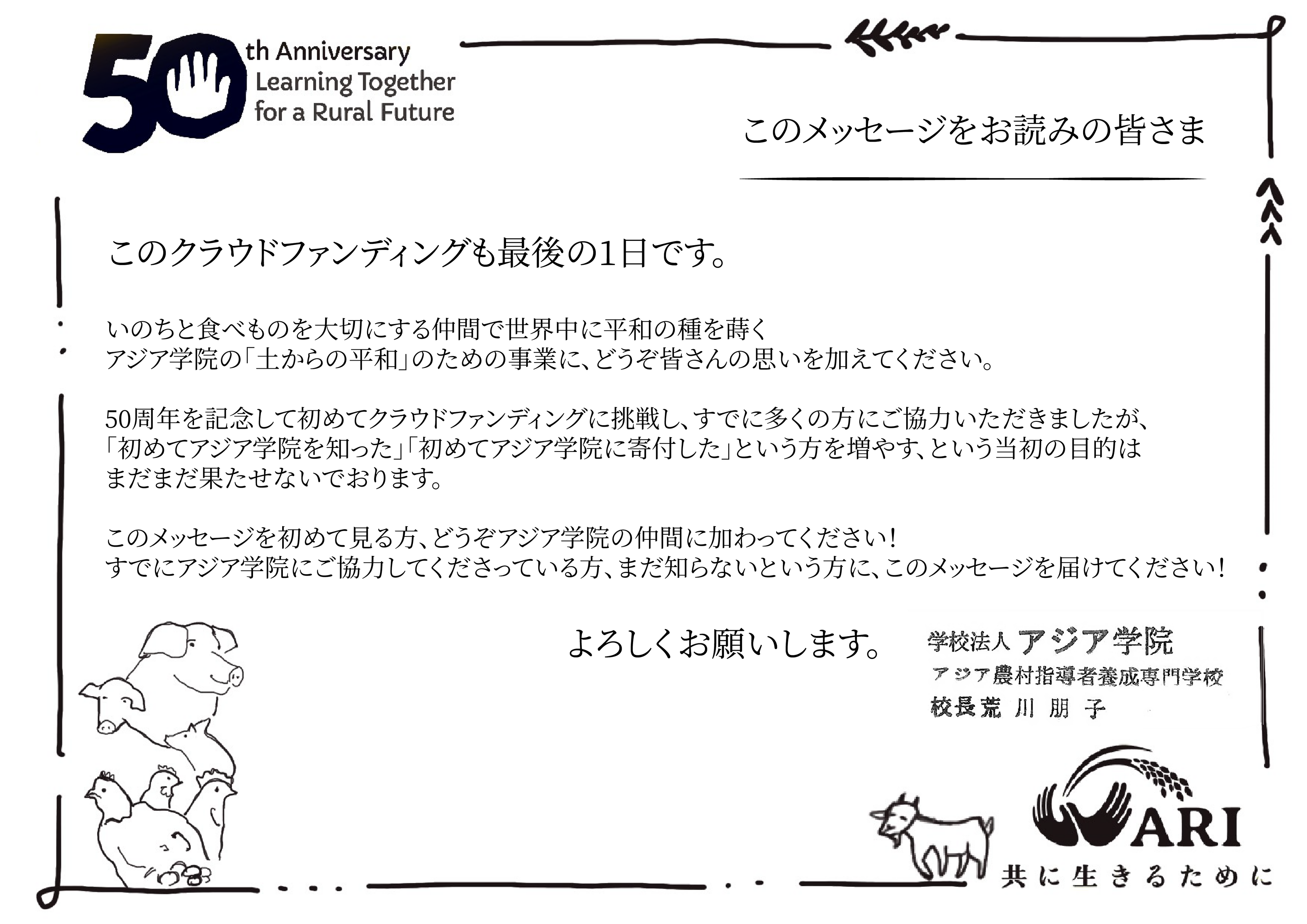 「途上国で「土からの平和」をつくるリーダー育成環境」するまでを、一緒に目指してつくりあげていただきたくのためにこのクラウドファンディングプロジェクトを実施し、共感いただける方々に覚えていただくために50周年のこの機会に様々な取り組みを展開しています。