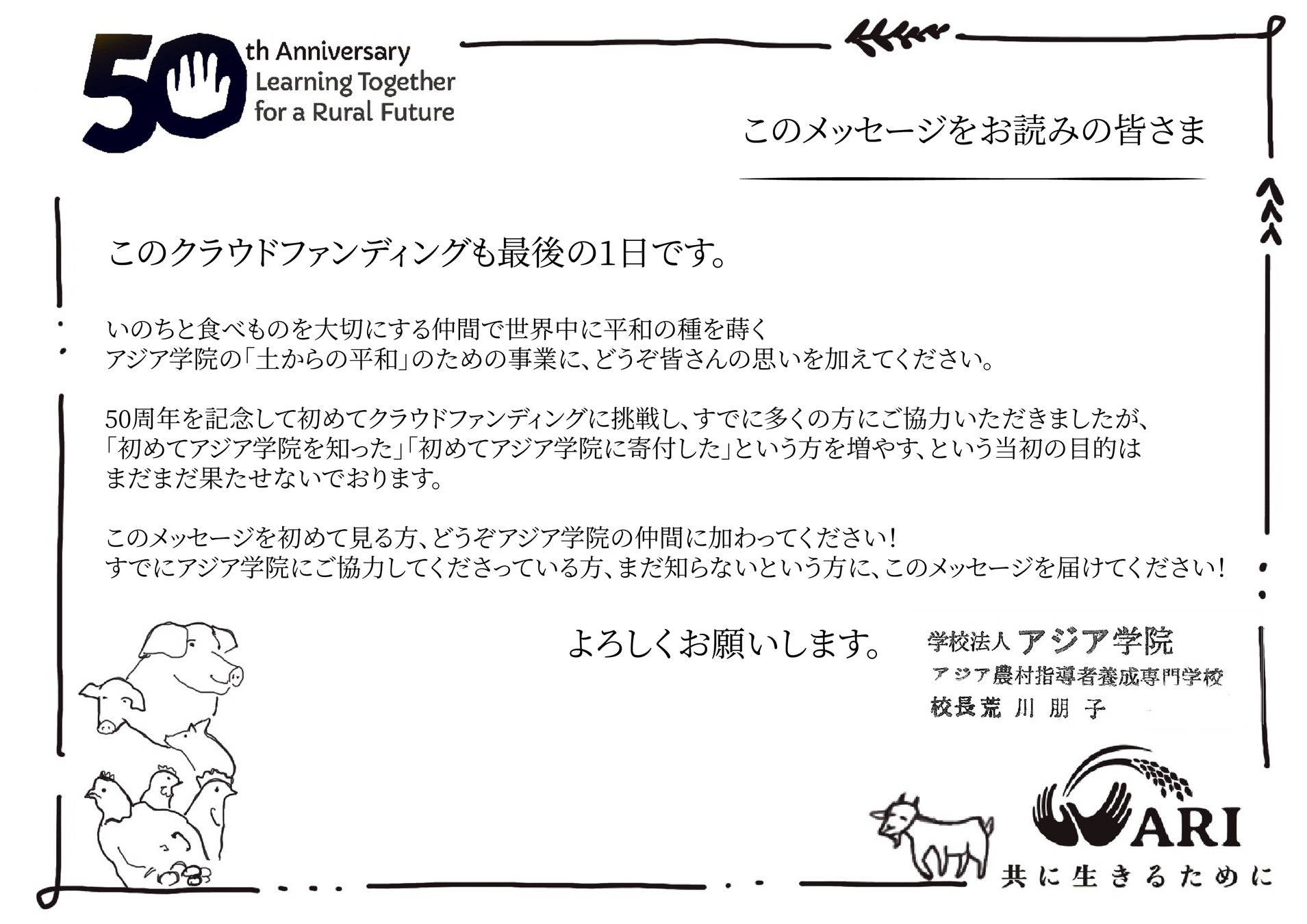 いよいよアジア学院クラウドファンディングも本日10月31日(火)最終日になりました。