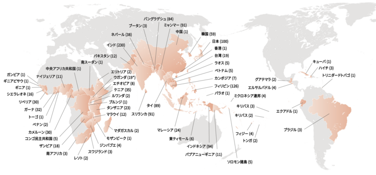 アジア学院の卒業生は1,399名、62ヵ国の800を超える農村コミュニティで活動するリーダーたちです。(2023年10月現在)