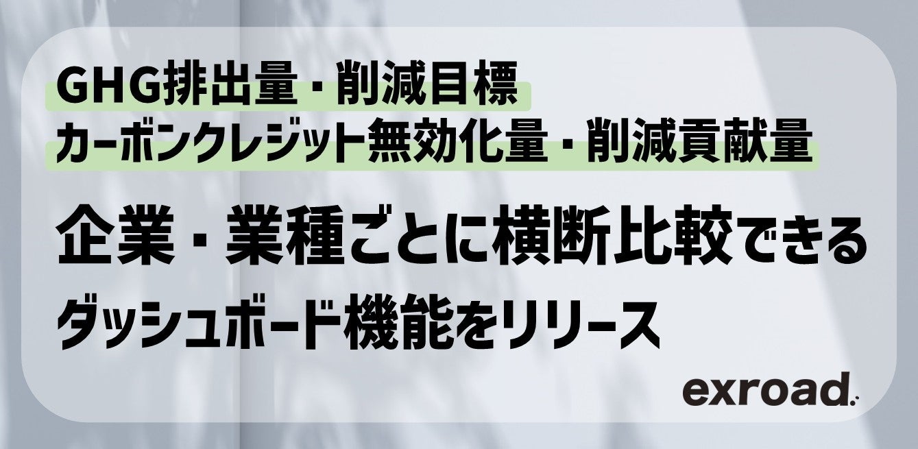 カーボンプライシング領域オールインワンデータプラットフォームを提供する株式会社exroad(エクスロード、本社:東京都港区、代表取締役:木村圭佑、以下当社)はこのたび、企業のGHG(温室効果ガス)排出量、削減目標、カーボンクレジット無効化量、削減貢献量を横断的に比較できるダッシュボード機能を開発・リリースしました。大手企業を中心に600社以上のデータを搭載した本ダッシュボードにより、企業ごとの排出量削減の進捗や方針の違いが可視化され、サステナビリティ戦略の策定・評価に役立つインテリジェンスを提供します。