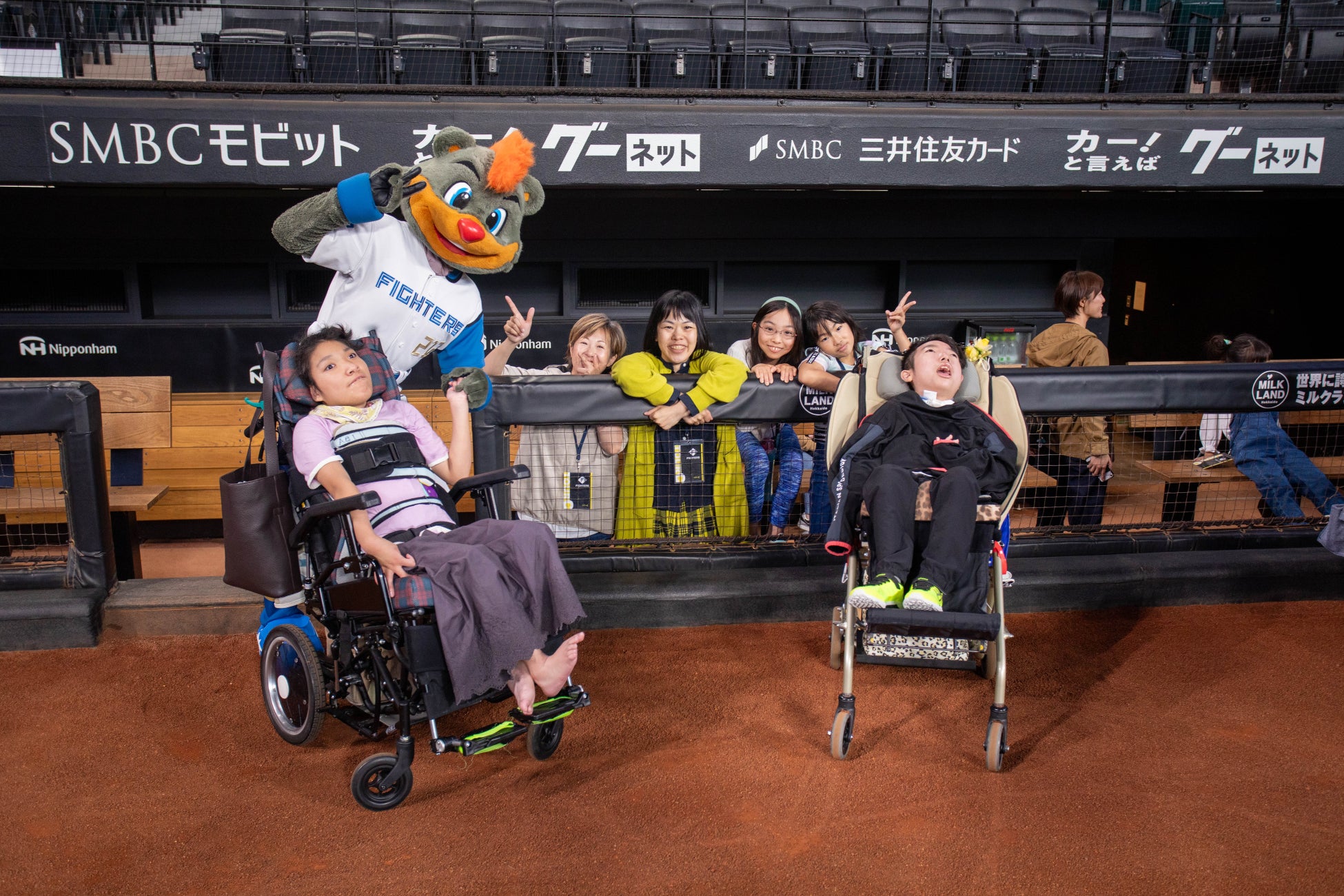 集合場所で、B•Bがお出迎えしてくれて、ファイターズガールによる解説とともに、グラウンドやベンチなどをB•Bとともに見学しました。