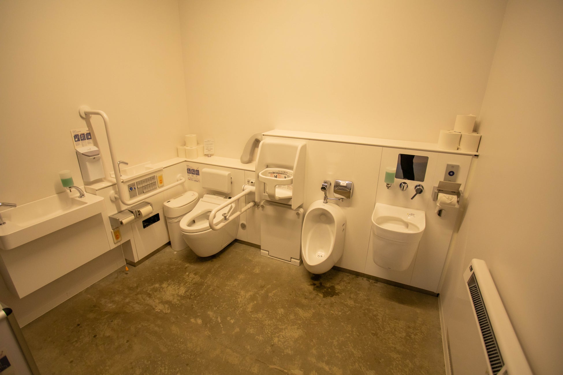 これくらいの広さがあると、バギーのまま入ることができるので、リクライニングを倒して尿取りパットの交換だけで済む場合は、妥協案として、こちらのトイレを利用できるかもしれません。