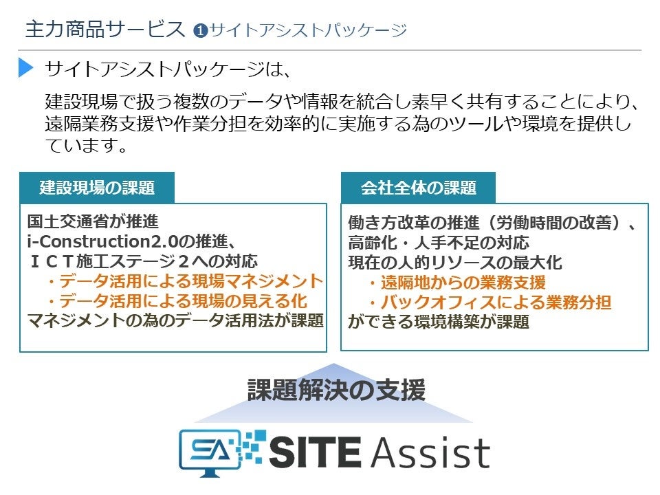 当社グループでは従来、建設業・建設現場を主要顧客として、主に建設現場を支援する商品・サービスの開発と提供に努め、ハードレンタルを主としたITインフラ環境の構築支援を積極的に展開してまいりました。対してこの中期経営計画期間においては、ハードレンタルを主としたビジネスから脱却し、建設現場の業務支援に特化してデータ・情報関連サービスを統合的に提供していくことで生産性の向上に貢献し、付加価値を創出するビジネスへと事業転換を図り、活動しております。その中核がDDS事業において統合的なサービスとして提案を進めているSAPです。SAPでは、当社が建設現場向けに提供している各種ICTサービス(「クラウドストレージサービス」・「クラウド映像サービス」・「コミュニケーションサービス」・「通信・ネットワークサービス」・「多機能ディスプレイ」等)を統合し、建設現場の遠隔支援など効率的に行える情報共有インフラとして普及を推進しております。これにより建設業界における現場の見える化及びデータ・情報の利活用の推進を強力に支援し、建設業界の生産性の向上に貢献してまいります。