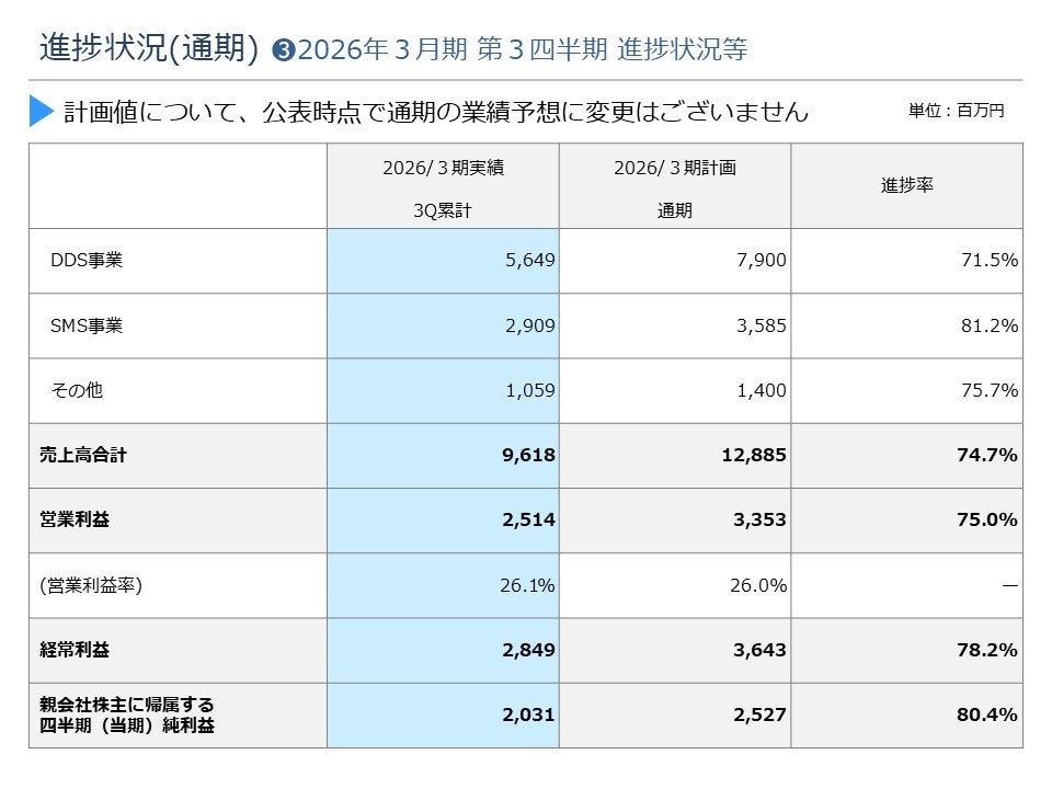 売上高は9,618百万円(進捗率74.7%)、営業利益は2,514百万円(進捗率75.0%)となり、2025年10月30日に公表しました通期連結業績予想から変更はございません。