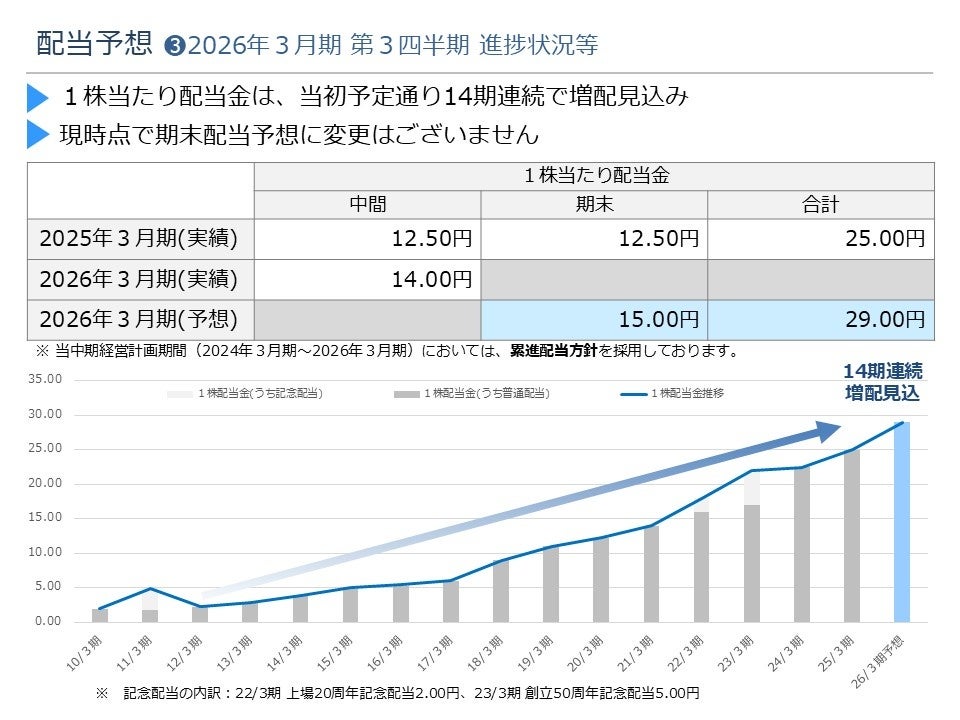 1株あたり配当金は、14期連続で増配見込みであり、2025年10月30日に公表しました期末配当予想から変更はございません。