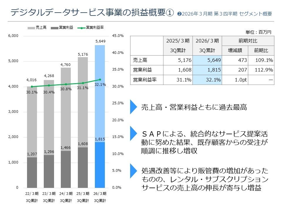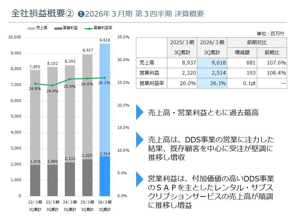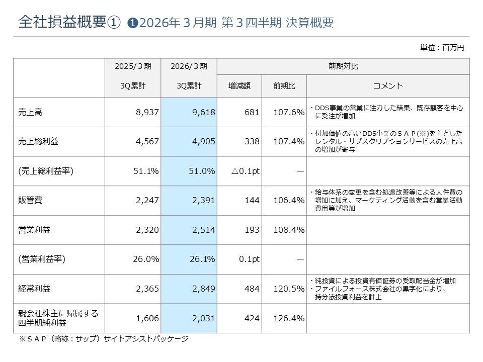 DDS事業のサイトアシストパッケージ(略称:SAP(サップ))を主とした、付加価値の高いレンタル・サブスクリプションサービスの営業に注力した結果、売上高は9,618百万円(前年同期比7.6%増)、営業利益は2,514百万円(前年同期比8.4%増)で、四半期としてはともに過去最高となり、17期連続増収、15期連続増益、14期連続増配の達成に向けて順調に推移しております。