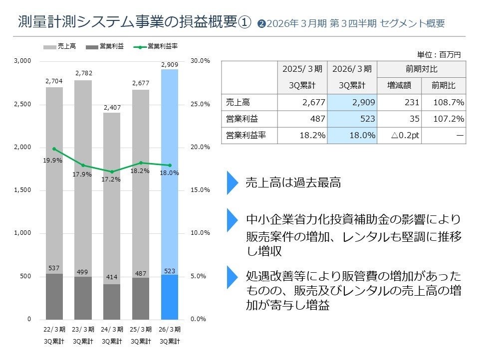 当事業につきましては、売上高は2,909百万円(前年同期比8.7%増)、セグメント利益(営業利益)は523百万円(前年同期比7.2%増)となり、四半期として売上高は過去最高となりました。