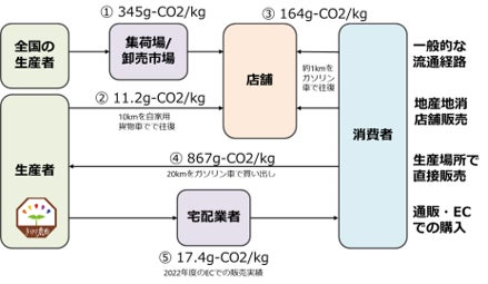 通販の場合、生産者から消費者までの平均距離は67km、中央値は38kmとなるが、集約後の営業用貨物車での配送距離の割合が大きく、効率性が担保され、⑤=17.4g-CO2/kgと低くなった。