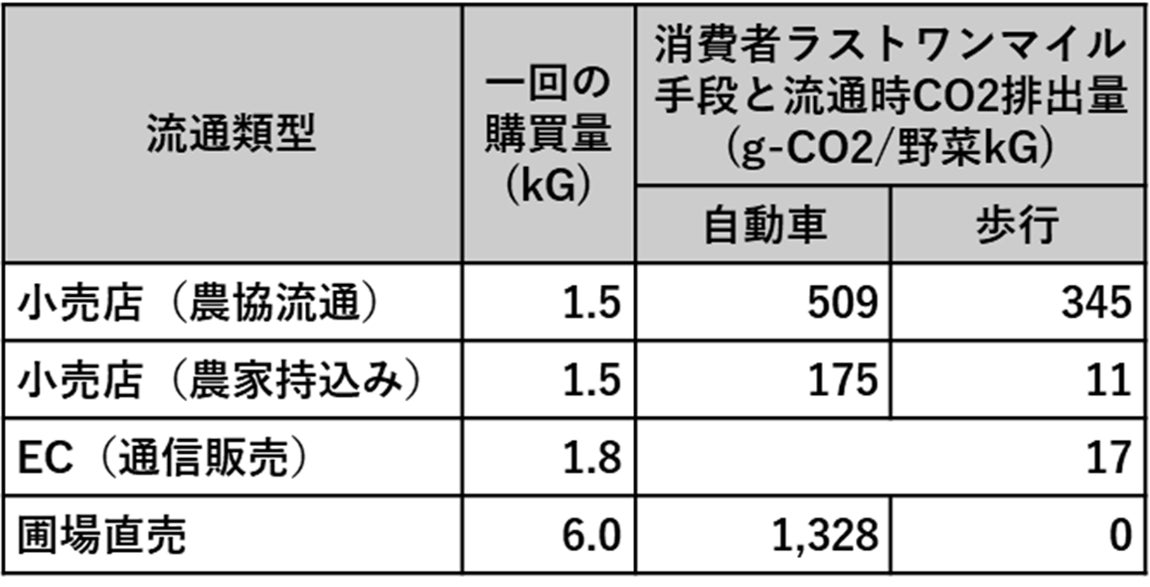 ①圃場に徒歩・自転車で出向き購買する場合は当然のことながら0g-CO2であるが、⑥自動車で出向けば最大(1,328)となる。その後排出量が少ない順に、➁農家が直接持ち込んだ小売店舗に徒歩で出向く(11)、③ECを宅配事業者が届ける(17)、④農家持ち込んだ店舗に自動車で出向く(175)、⑤農協流通品を販売する店舗に徒歩・自動車で出向く(345・509)となる。