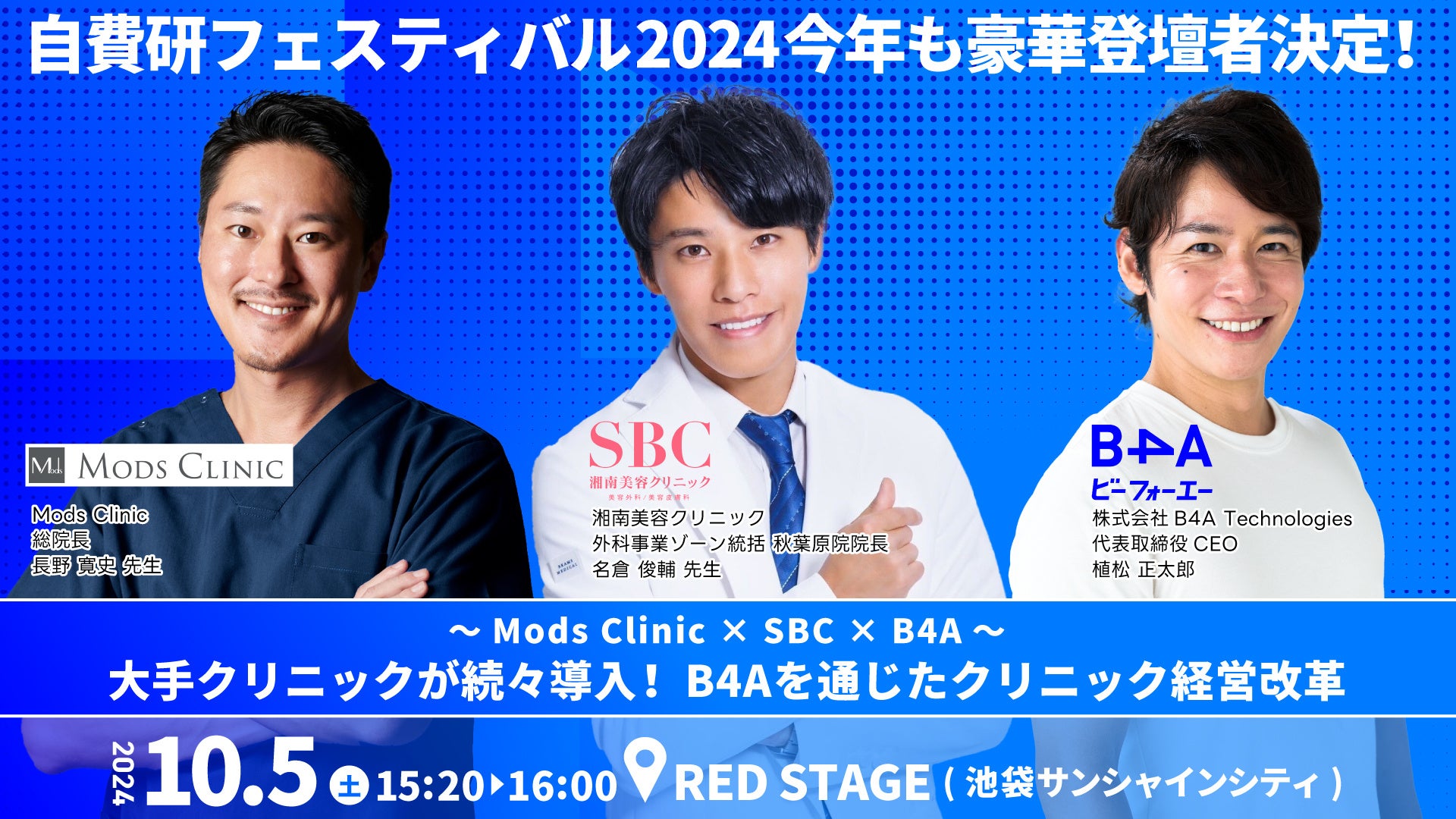 2024年10月5日(土)、池袋・サンシャインシティにて行われる『自費研フェスティバル』のRED STAGEにて、Mods Clinic 総院長 長野寛史先生、湘南美容クリニック 外科事業ゾーン統括・秋葉原院院長 名倉俊輔先生と共にB4A代表の植松が登壇します。
