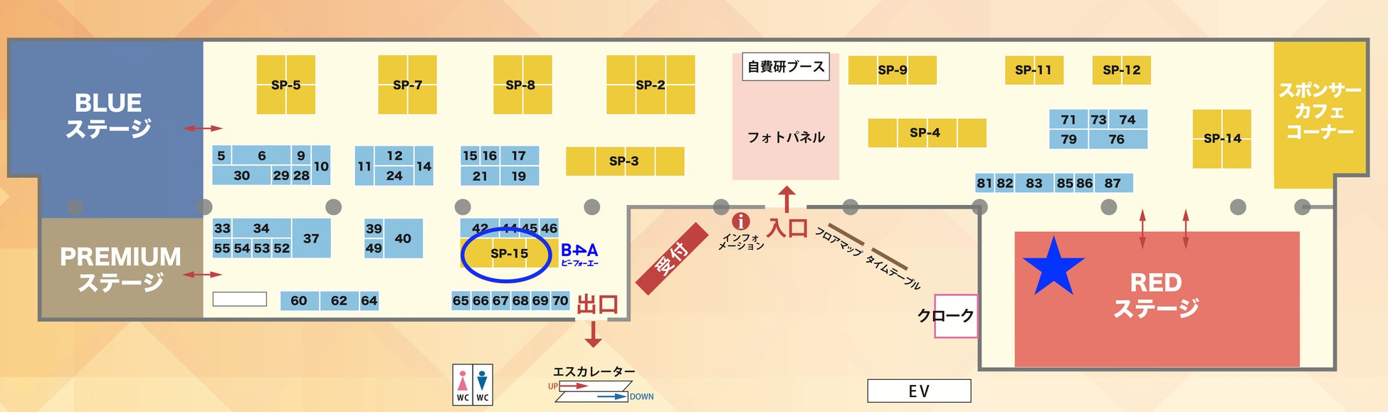 ▼下図の青い丸印の箇所にB4Aのブースがございます!ご来場の際はぜひお立ち寄りください!
