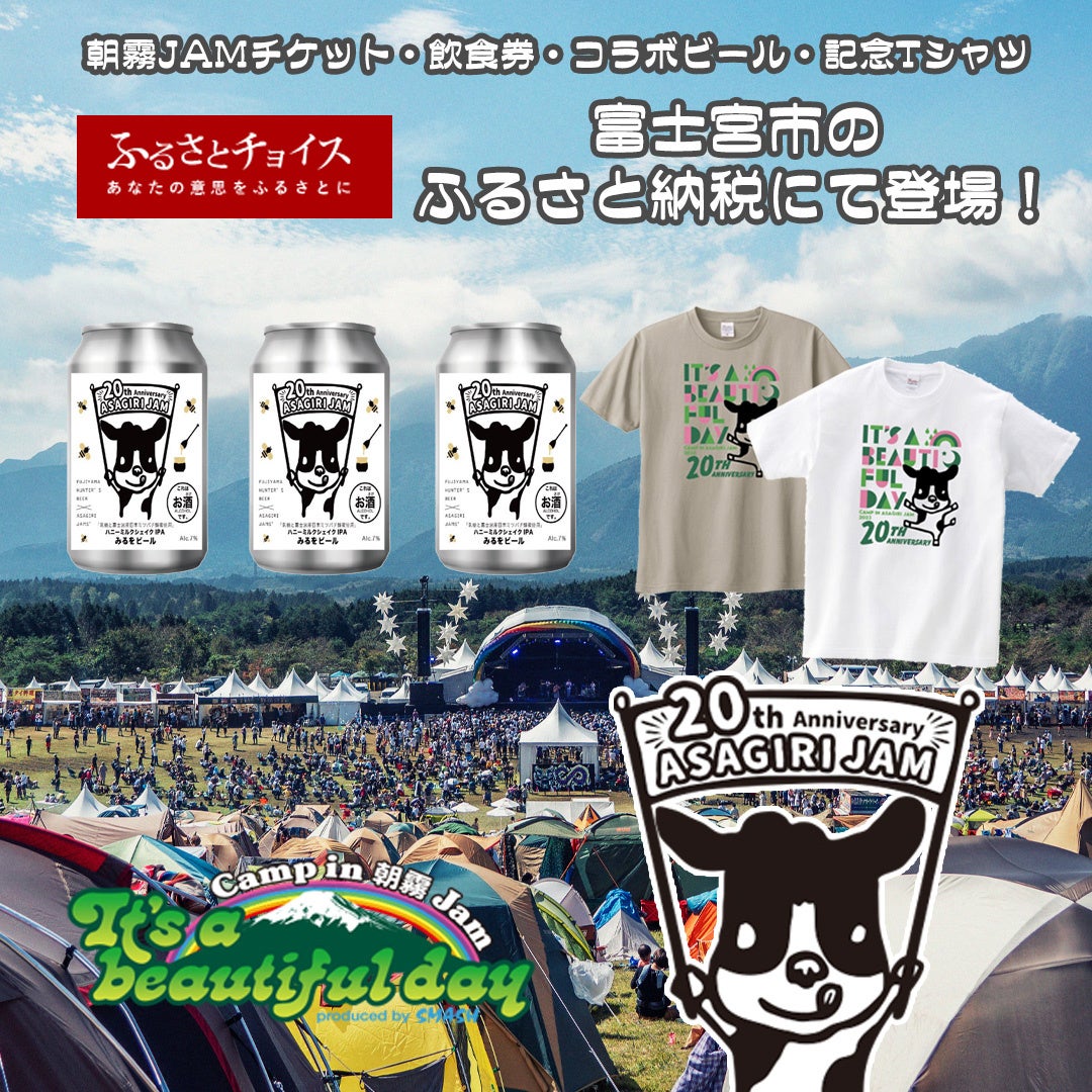 ¥10,000の寄付金でもらえる会場内飲食店限定お食事券(¥3,000相当)から、朝霧JAM’23のチケットや駐車券、バスツアー、レンタルテントなどがセットになったもの、更に開催20回目記念グッズ(オリジナルTシャツ、特別企画コラボクラフトビール)まで全16種類が、朝霧JAMの開催地・静岡県富士宮市へのふるさと納税の返礼品として、ふるさとチョイス限定で取り扱い中。(9/30(土)まで。)