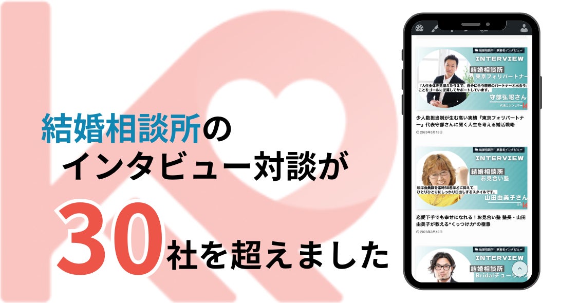 一見同じように見える結婚相談所でも、カウンセラーの得意分野や成婚までのアプローチはさまざまです。インタビュー記事を通じて、読者の皆様が各相談所の“リアルな人柄”を感じ取り、ご自身に最適な相談所を見つけるための一助となることを目指しております。この度、インタビューにご協力いただいた結婚相談所が30社を超えました。