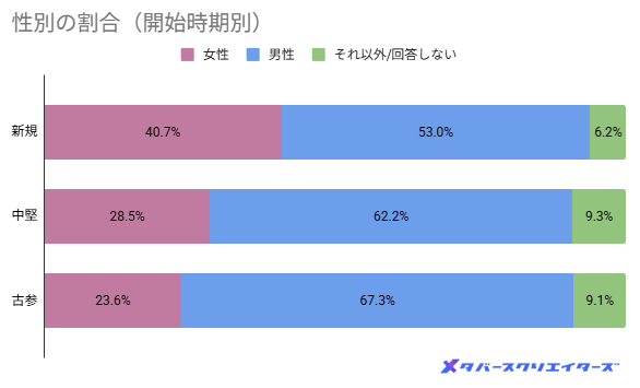 中堅層・古参層では女性比率が3割未満にとどまる一方で、新規層では4割を超える結果となり、参入層の広がりがうかがえます。
