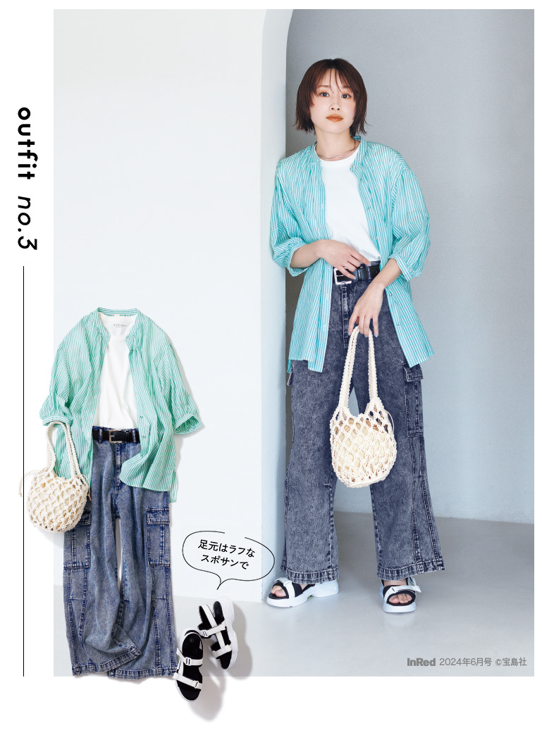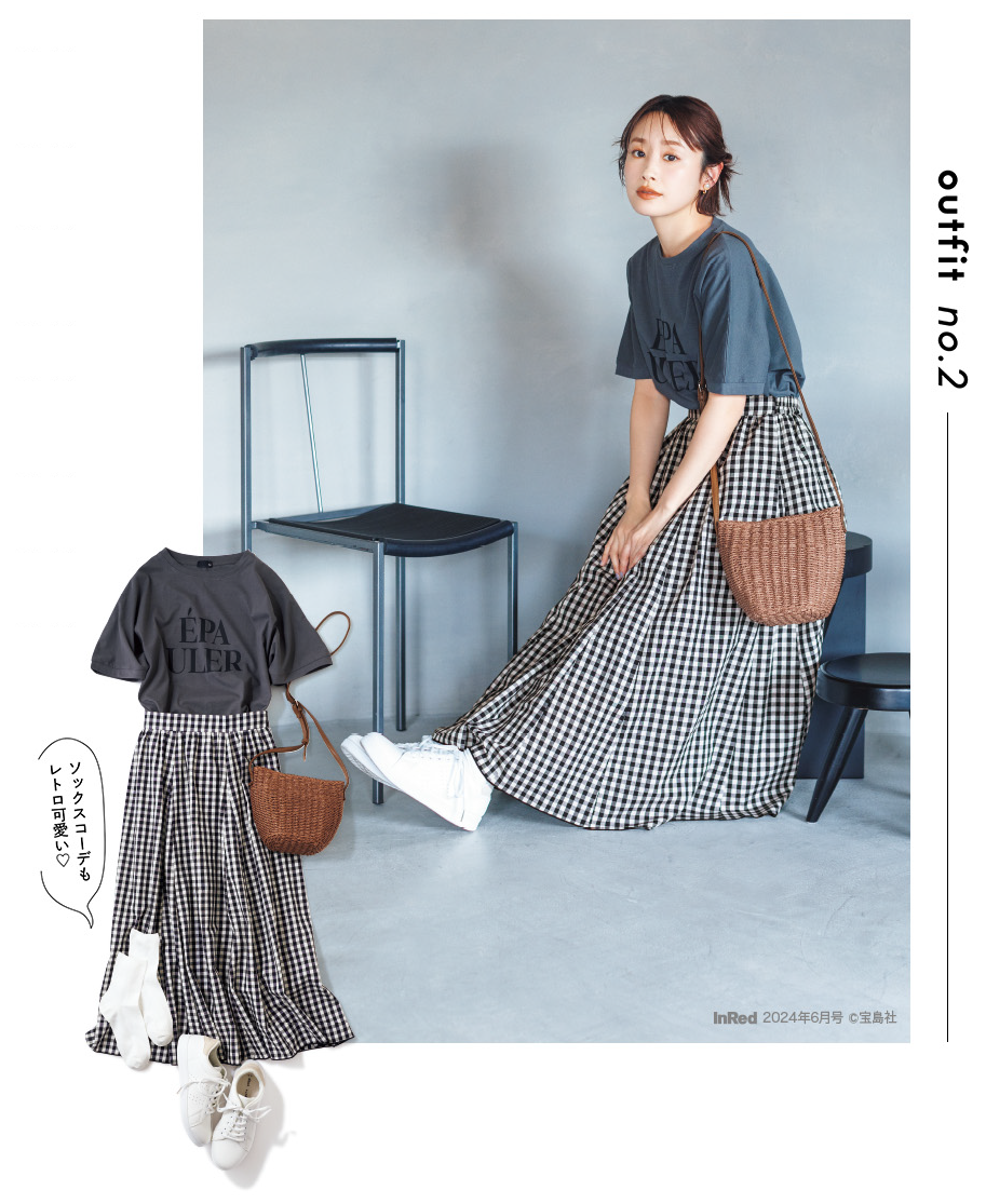 白のコートスニーカーで抜け感を作りつつ、カゴバッグで夏らしさをオン。