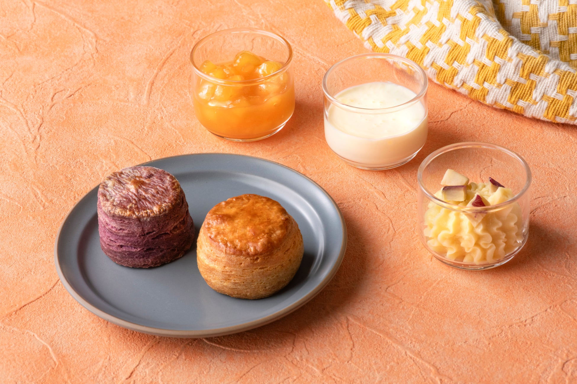 定番のプレーンスコーンの他、紫芋のパウダーを生地に練りこみ焼き上げた紫芋スコーンを今期限定でご提供いたします。なめらかな口溶けのクロテッドクリームや、角切りのリンゴとディルマのアールグレイを煮だして炊き上げたアップルティージャム、なると金時のペーストにバターなどを練り込んで角切りの鳴門金時を加えた贅沢なクリームと一緒に、お好みに合わせてご賞味ください。