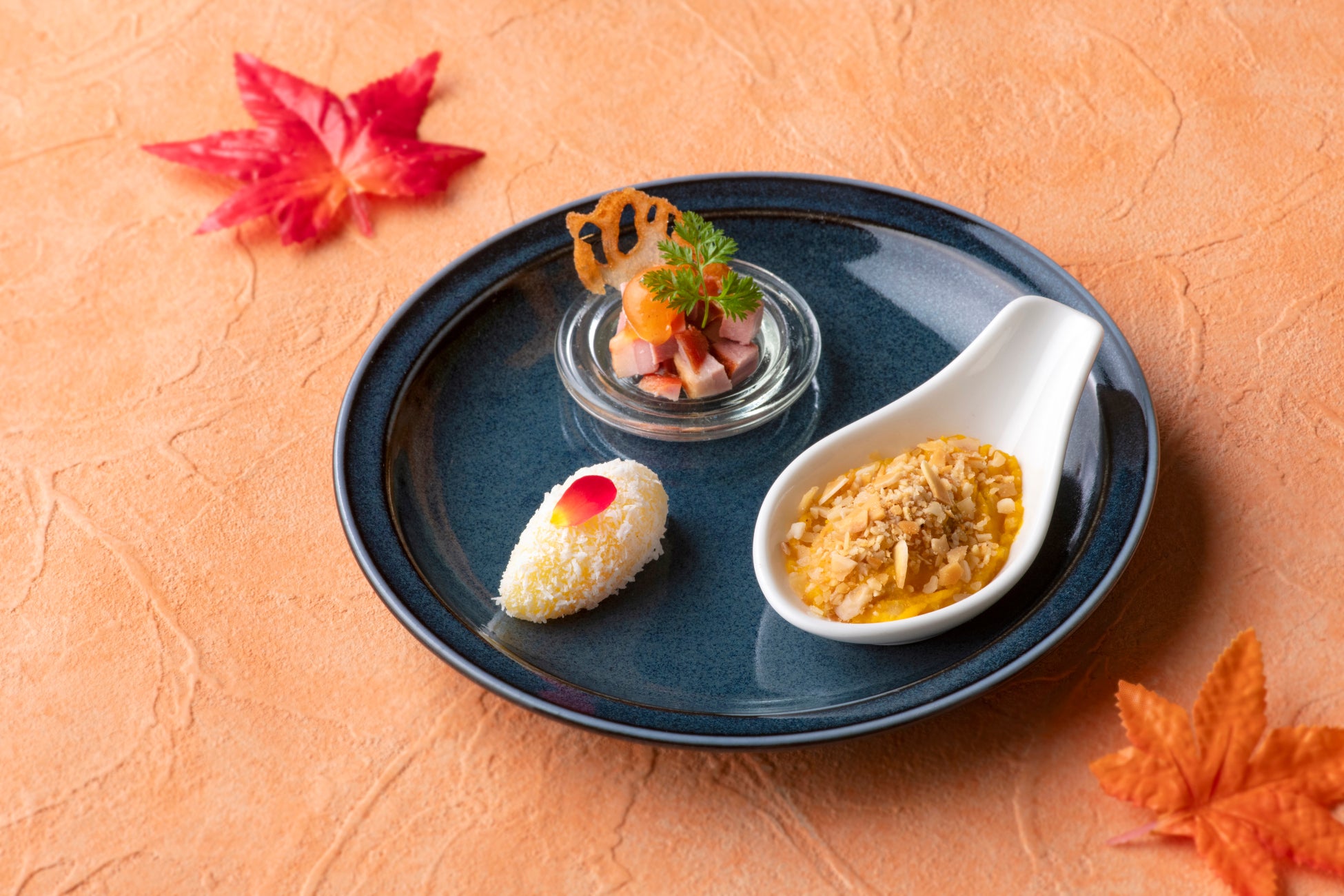 フルーツと相性が良く、うま味の強いスモークダックに、秋の味覚である柿のジュレを合わせた一品。食感と味わいのアクセントにレンコンチップを添えています。香りの良い鴨肉と、まろやかな甘さの柿の組み合わせをお楽しみください。