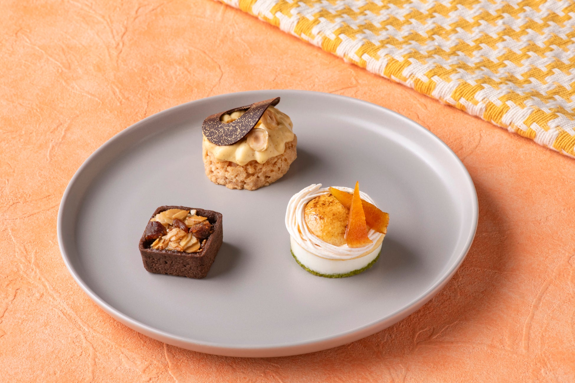 また、セイボリーには、旬のサツマイモの素材の味を生かした濃厚な味わいのスイートポテトに相性のよいココナッツの香りを纏わせた「スイートポテトとココナッツファイン」や、うま味の強いスモークダックと完熟した柿のジュレの相性が抜群の「スモークダック 柿のジュレとともに」、パン粉の代わりに香ばしいローストアーモンドと一緒に焼き上げた「パンプキンのスコップグラタンコロッケ」など、食欲の秋にピッタリの6種類のメニューを取り揃えました。
