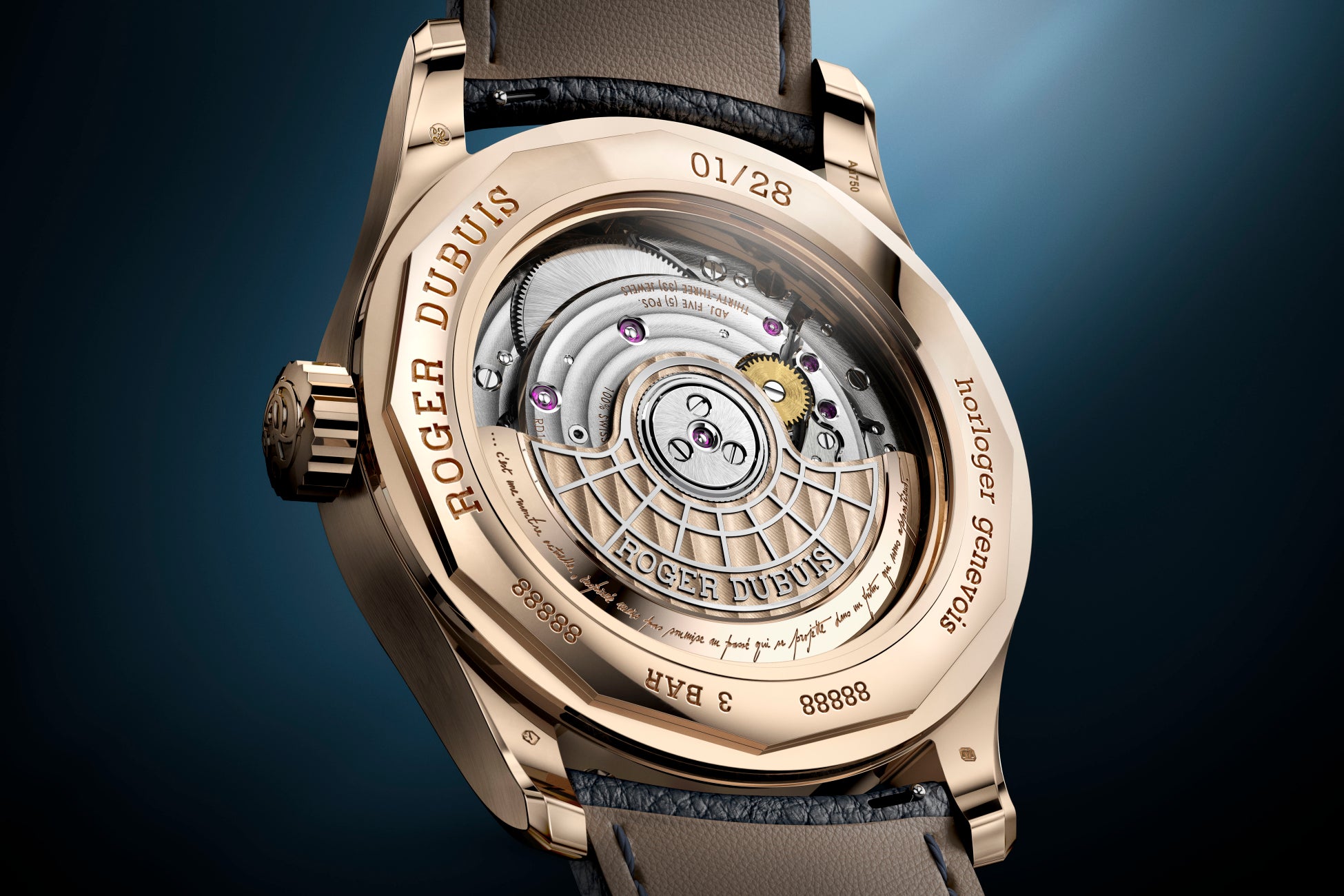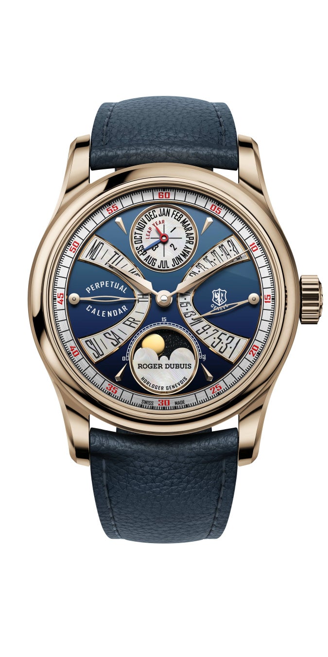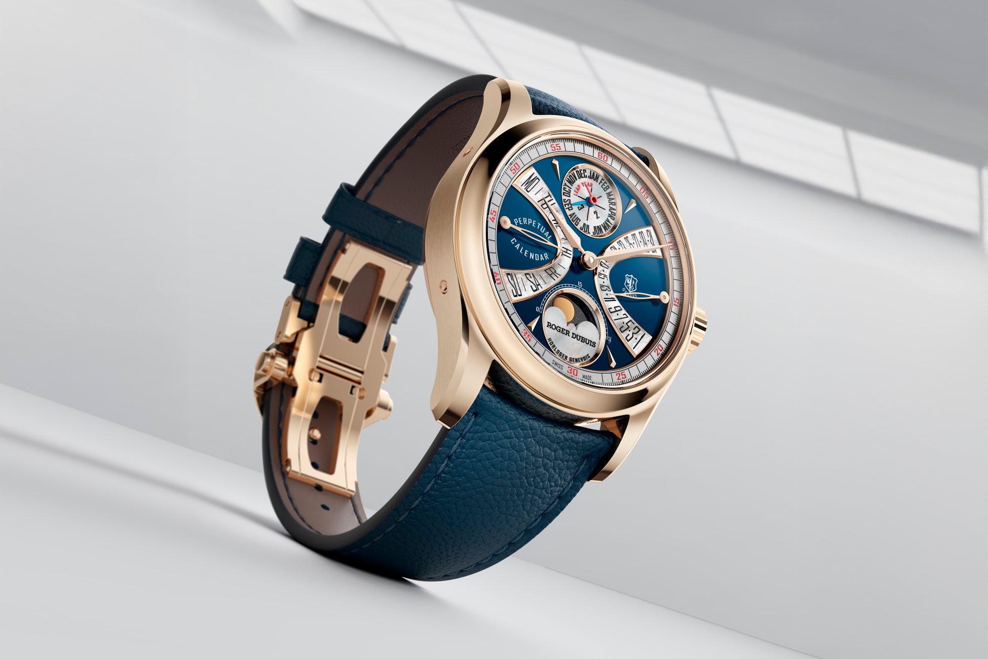 18Kピンクゴールド製ケースに収められた38mmのタイムピースは、インターチェンジャブルなブルーのレザーストラップを備え、バックルにはロジェ・デュブイのオリジナルエンブレムがあしらわれています。
