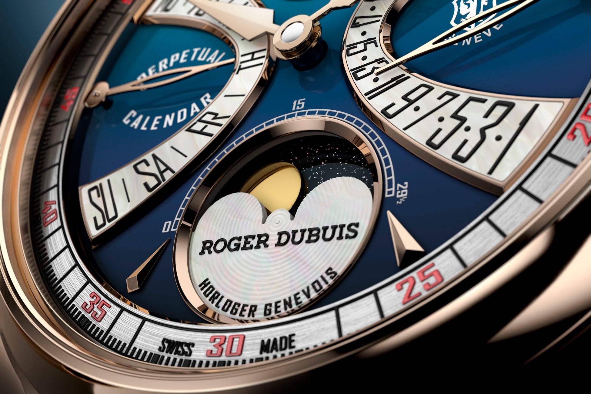 フランジにはサーキュラーブラッシュ仕上げとロジウム加工を施し、転写数字とミニッツトラックを備え、アングルポリッシュ仕上げを施すことによってさらなる輝きを添えました。カレンダー表示部分にはマザーオブパールを使用し、転写テキストと手作業で面取りされた仕上げを特徴としています。地板には「レマンブルー」として知られるカラーを採用しました。このカラーは、ロジェ・デュブイ氏が時計製造を学ぶべくジュネーブとヴヴェイの間を通学していた際に毎日眺めていたレマン湖へのトリビュートカラーです。ラッカー仕上げを施すことで穏やかで奥深い色彩を表現し、アワーマーカー、転写テキスト、ムーンフェイズ表示を特徴としています。カウンターにもマザーオブパールを使用し、より幅の広いサーキュラーブラッシュ仕上げと転写テキストを配しました。ムーンフェイズのレイヤーにはブルーアベンチュリンをベースに使用し、18Kイエローゴールド製の月を浮かべました。