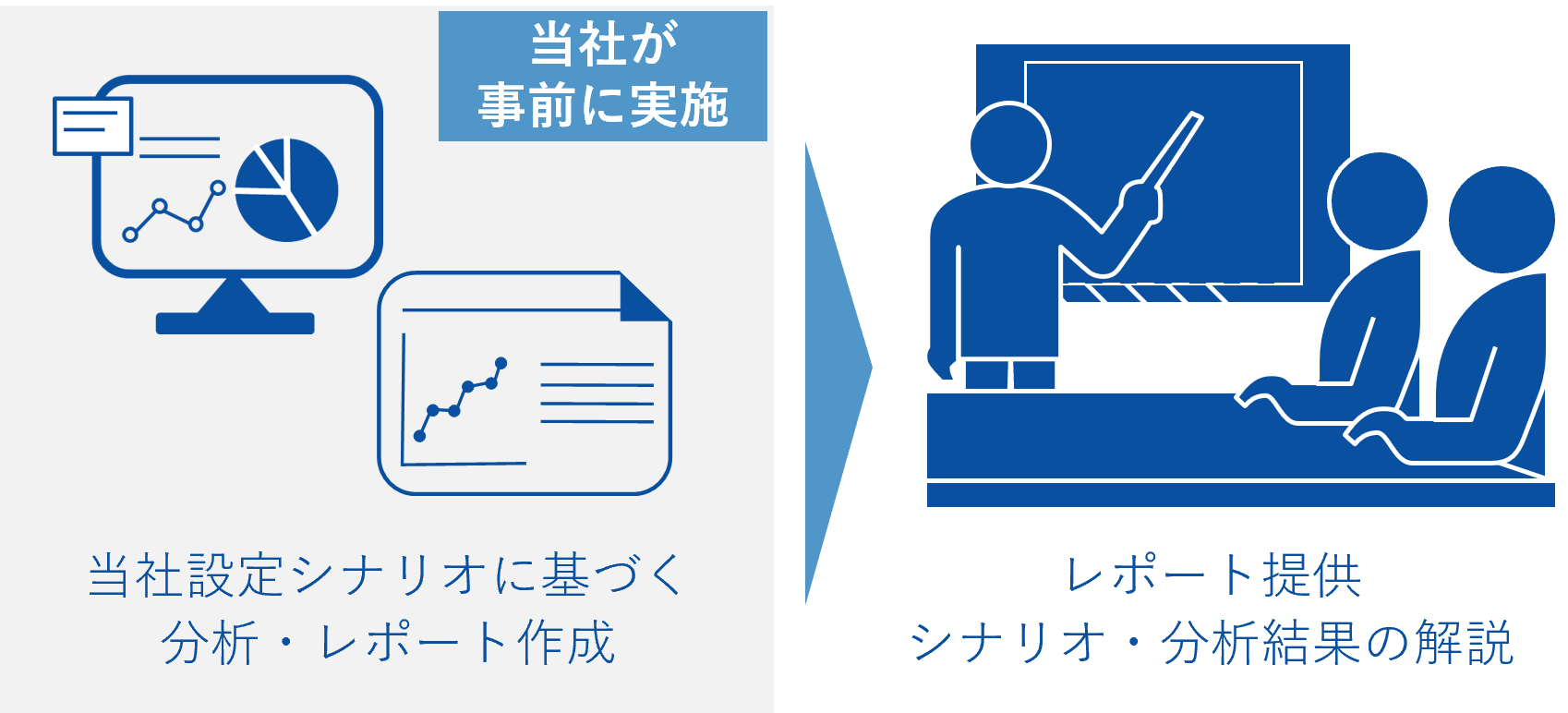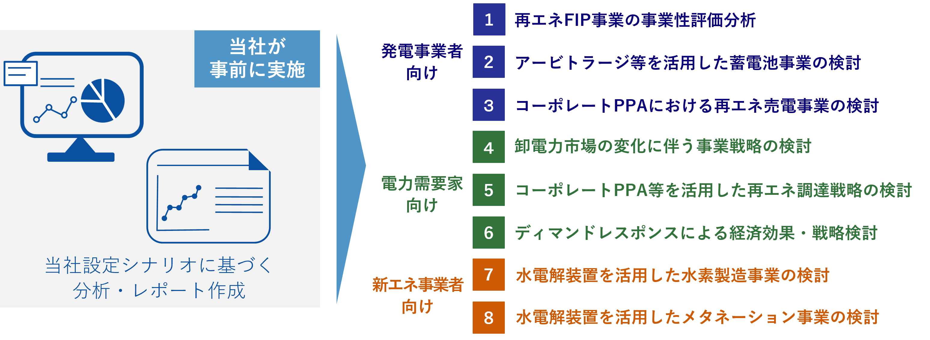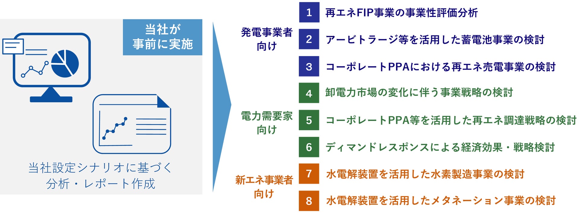 本サービスは、中長期の電力需給制約による出力抑制と卸電力市場価格の見通しについて、当社が設定したシナリオに基づき事前に作成したレポートと分析データを提供することで、お客さまの再エネ事業や関連事業の初期検討・定点観測を支援するものです。従来のお客さま個別のシナリオ設定に基づくシミュレーションを実施するコンサルティングサービスと比較して、分析レポートの迅速な提供、費用の大幅削減が可能となります。分析結果のデータも合わせて提供しますので、お客さま自身での事業検討や追加的な分析にもご活用いただけます。また、事業性評価や事業戦略の立案支援など、本サービスの分析結果を活用したコンサルティングサービスも展開いたします。