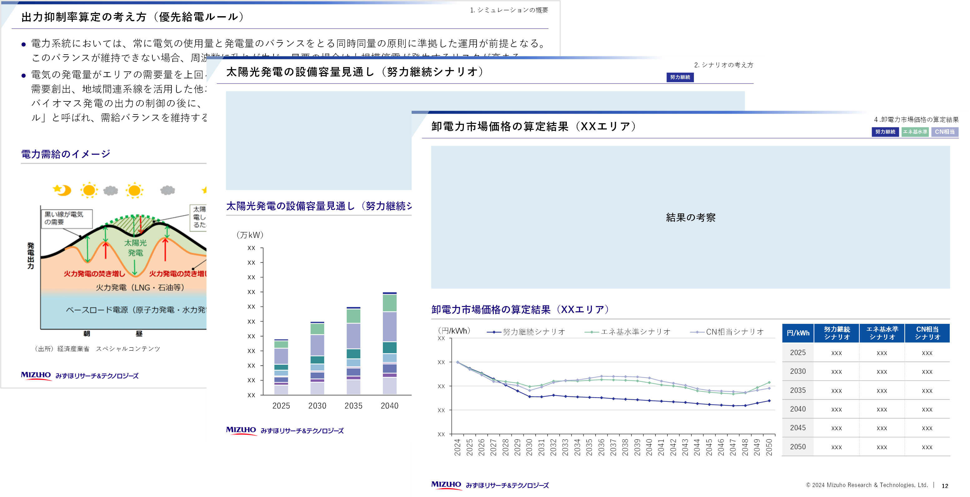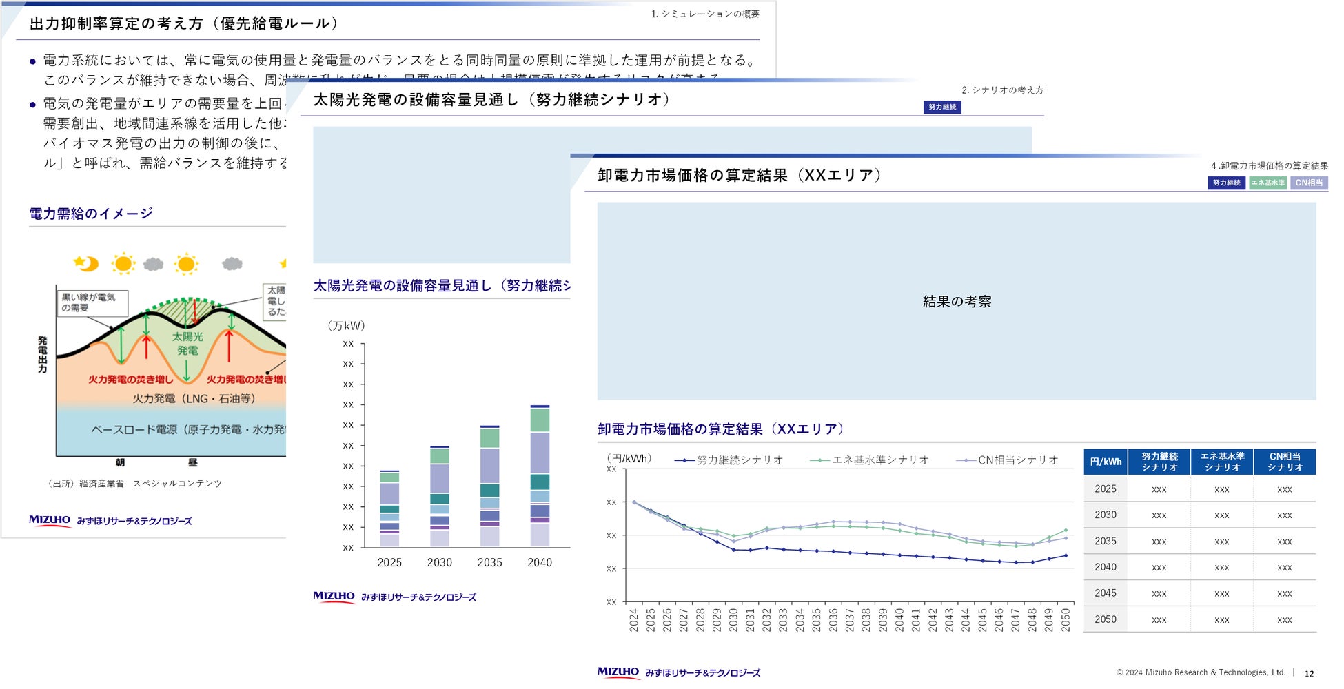みずほリサーチ&テクノロジーズでは、これまで、発電事業者を対象に出力抑制のシミュレーションや卸電力市場価格の見通し分析などのコンサルティングサービスを提供してきました。このたび、昨今の分析ニーズの高まりを受け、広くお客さまに出力抑制・卸電力市場価格見通しの分析結果を提供するレポート販売型のサービスを開始いたします。