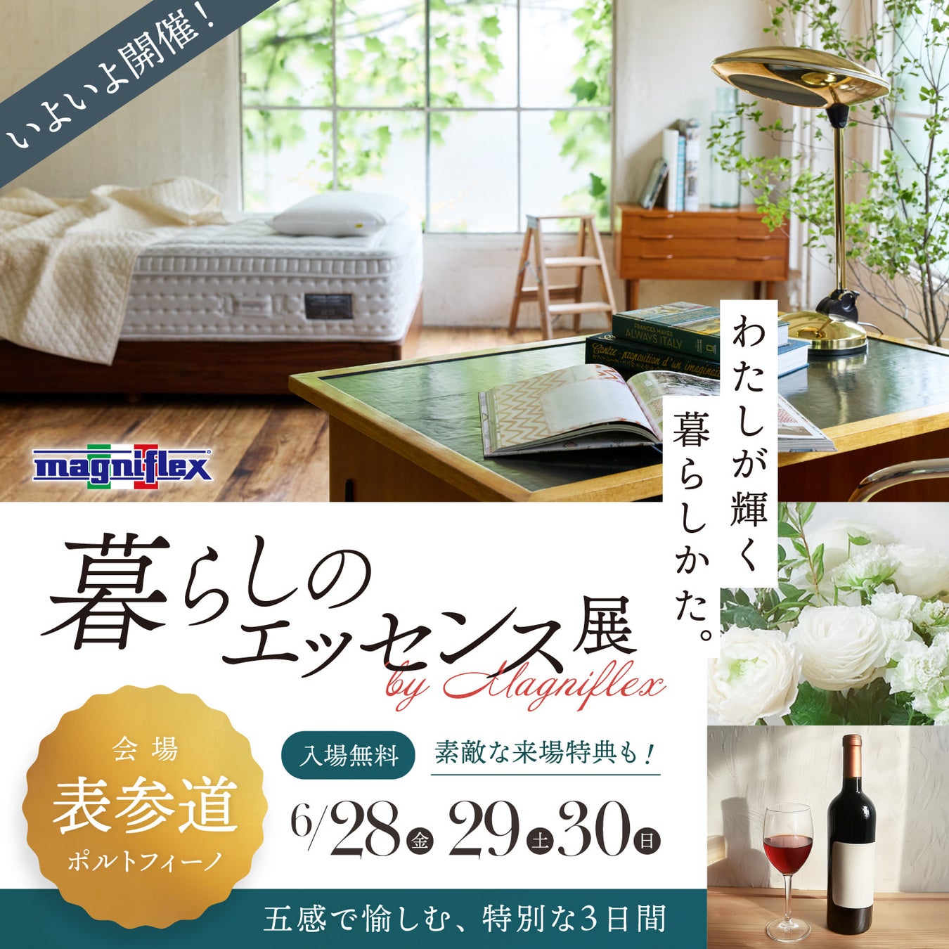 内容:暮らしの体験/記事展示/マニフレックス体験/特別コラボ演出/入場特典(富士屋ホテル入浴パウダー・イタリアンスパークリングドリンク)