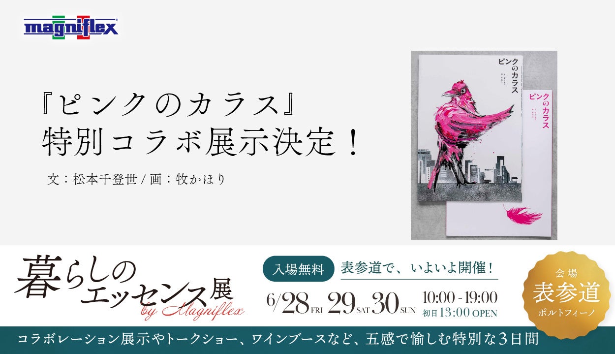 マニフレックス(総輸入販売元 株式会社フラグスポート・東京都港区 代表取締役 山根崇裕)が6月28日(金)~30日に表参道で開催するポップアップストアにて、エディター・ライターの松本千登世さんの絵本『ピンクのカラス』(文:松本千登世 / 画: 牧かほり)の特別展示を実施することが決まりました。