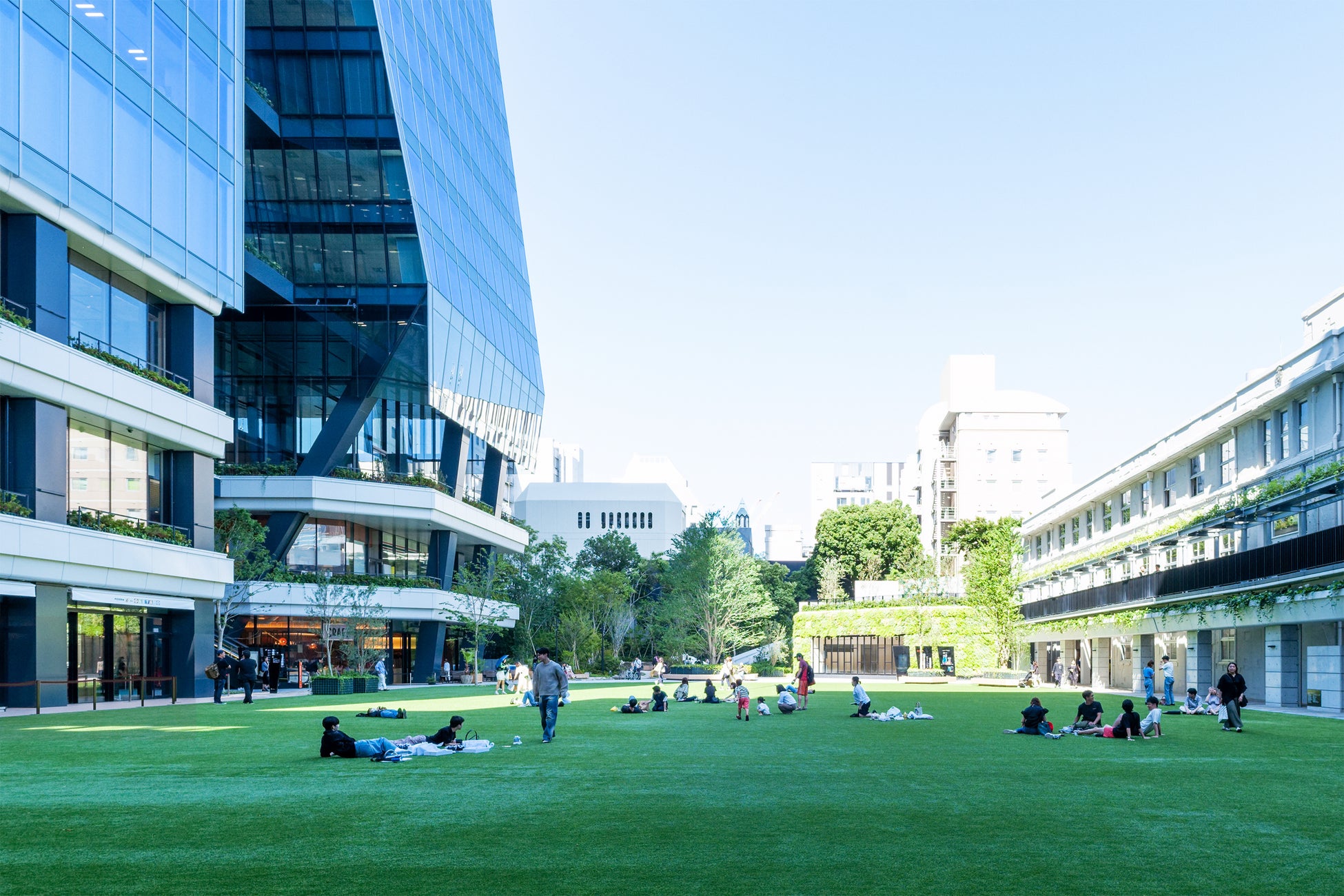 福岡大名ガーデンシティは福岡市中心部の旧大名小学校の跡地活用事業です。オフィス、ホテル(ザ・リッツ・カールトン)、商業施設を組み込んだ「タワー棟」と、住宅や創業支援施設、地域の公民館からなる「テラス棟」、さらに消防団施設、イベントホール、広場を加えた複合施設で構成されています。長く地域に親しまれてきた旧小学校のグラウンドを都市に開放された広場として再生し、市民や地域住民、オフィスワーカー、海外からのホテル宿泊客など、多様な人々が集まるグローバルなビジネス環境とクロスカルチャーの拠点となりました。「タワー棟」の形態は、広場に通じる通路を中心に二つのボリュームに分割し、前後に雁行させることで、都市のアイコンとなる躍動感と象徴性を持たせています。この形態は、かつて城下町であった大名地区に残る「かぎ型」の町割に由来しており、貫通通路の視認性を高めるとともに、市の中心部である天神からの人々の流れを広場へと導くことで、天神エリア全体の交流と憩いの空間を創出しています。
