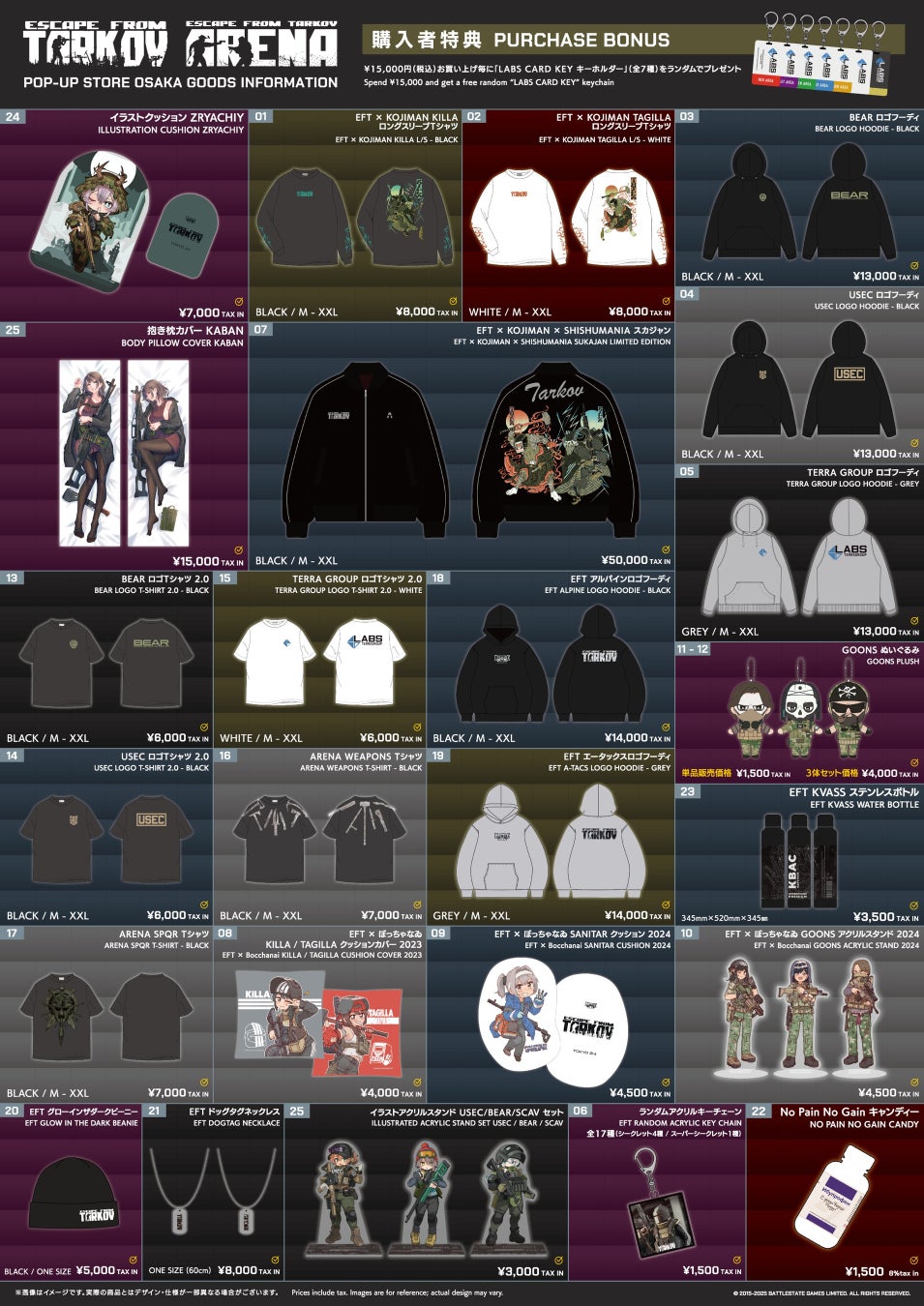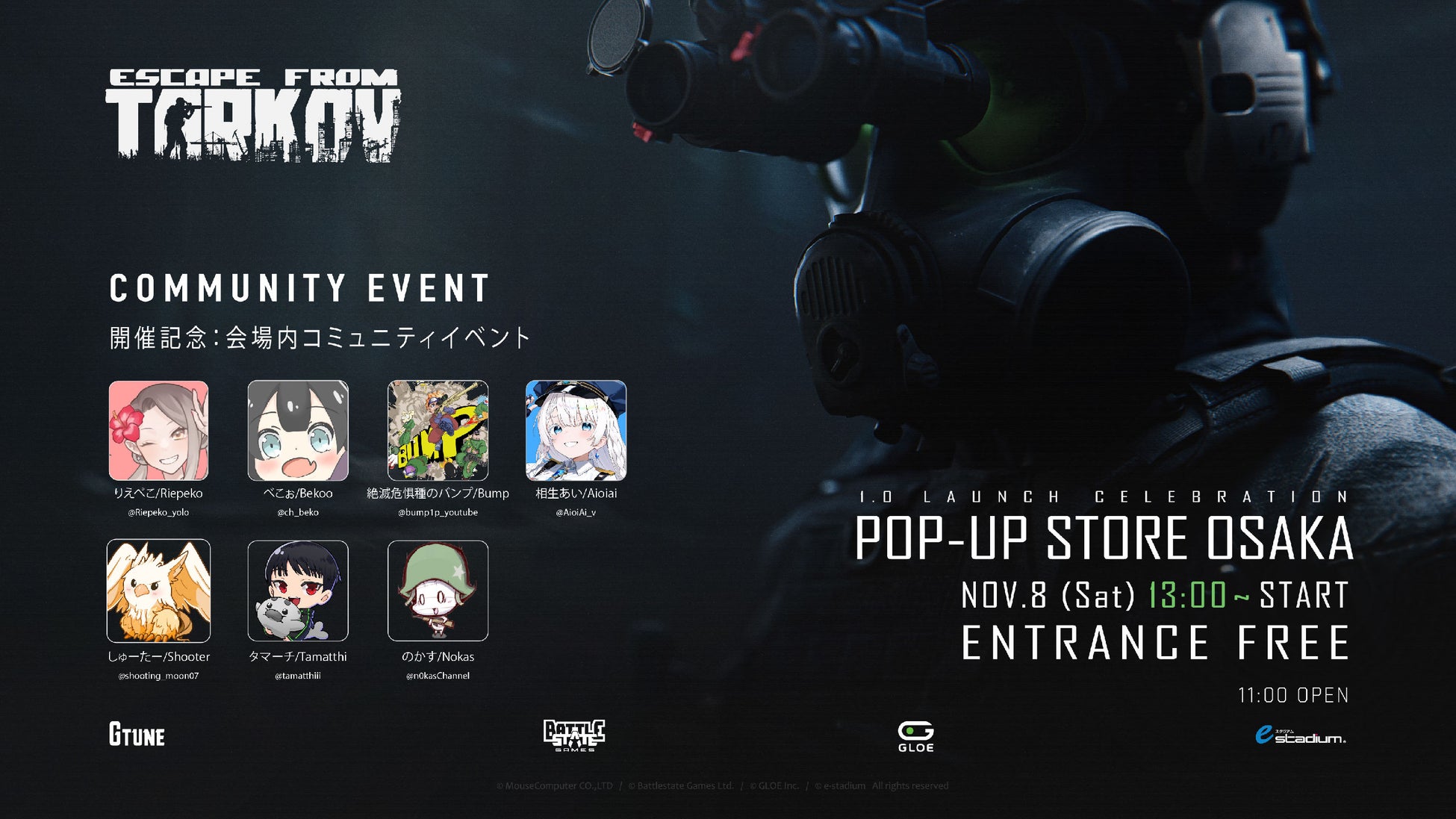 コラボ期間である11月6日(木)〜18日(火)では、ポップアップショップ「1.0 LAUNCH CELEBRATION POP-UP STORE OSAKA」が開催され、ここでしか手に入れることができない公式グッズを多数販売いたします。また、eスタジアムなんば本店の壁紙やLEDビジョンには、「Escape from Tarkov」のリアルなグラフィックが装飾されており、リリースを心待ちにするプレイヤーの皆様に、さらなる期待感と興奮をお届けします。イベント詳細は以下の通りです。
