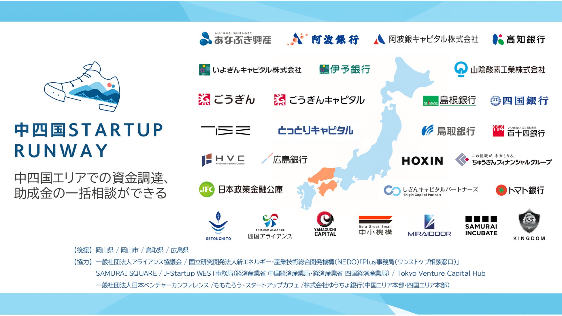 BtoB総合サービス業を展開する株式会社BtoBホールディングス(所在地:岡山県岡山市、代表取締役:仁科 慎太郎)のグループ会社で、企業や事業への出資・経営支援を行う株式会社キングダム(所在地:岡山県岡山市、代表取締役:仁科 慎太郎)は、株式会社サムライインキュベート(本社:東京都港区、代表取締役:榊原 健太郎)の支援のもと、起業家支援を行う地方銀行やベンチャーキャピタル(以下 VC)と連携し、中四国エリアにおける起業家の情報格差をなくすプラットフォーム「中四国STARTUP RUNWAY」を2025年5月29日(木)よりリニューアルオープンいたしました。