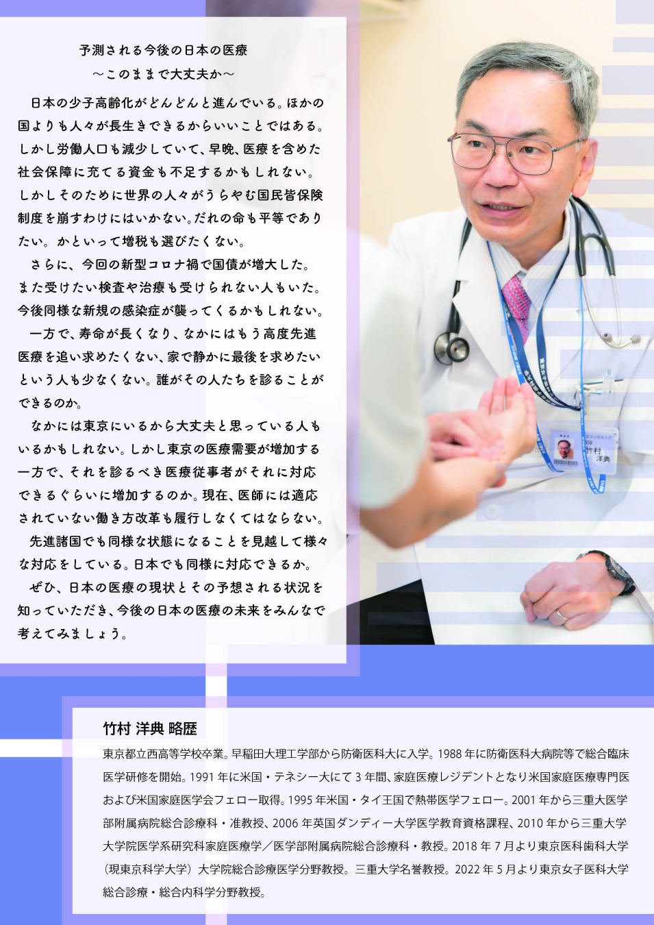 少子高齢化の進展、医療費の増大、医療従事者不足など、わが国の医療は今大きな転換点を迎えようとしています。本講座では、最新のデータや現場の視点を交えながら、将来の医療の姿を多角的に解説し、私たち一人ひとりが考えるべき課題を共有いたします。