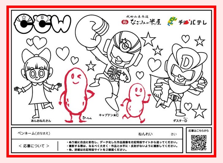 ●作品は塗り絵部分だけでなく、赤枠内(ペンネーム・応募について・QRコードの部分)まで見えるようにご応募ください。