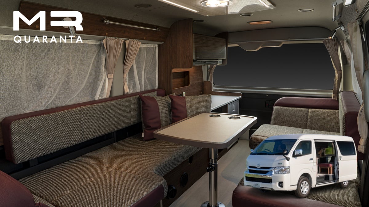 適度な2人の距離を保てるレイアウトで好評のキャンピングカー「レクビィ プラスMR」をベースに、後部にあったギャレーをスライドドア脇に移設し、後部にエアコンと電子レンジを標準装備したモデルになっています。