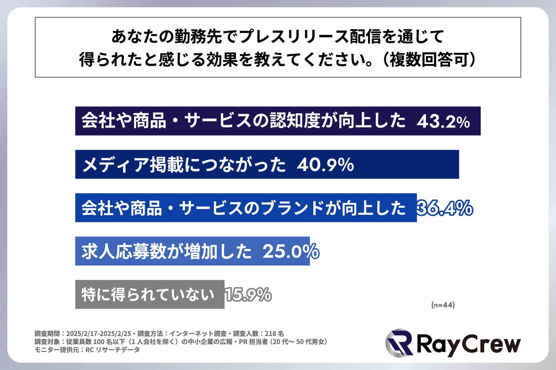 また、勤務先でプレスリリースの配信代行サービスを利用していないと回答された方に「勤務先でプレスリリース配信を通じて得られたと感じる効果」を尋ねる設問の回答では、1位が「会社や商品・サービスの認知度が向上した」で43.2%、2位が「メディア掲載につながった」で40.9%、3位が「会社や商品・サービスのブランドが向上した」で36.4%という結果になりました。この結果から、プレスリリースの配信で得られた効果として多くの人が感じていることは「会社や商品・サービスの認知度の向上」であることが明らかになりました。