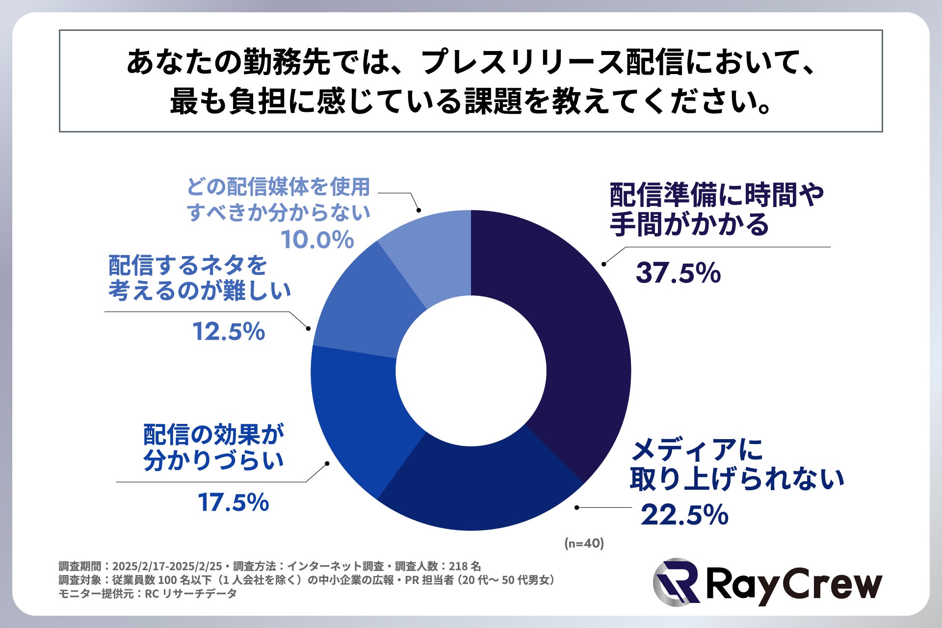 調査の最後、勤務先でプレスリリースの配信代行サービスを利用しておらず、プレスリリース配信において何らか課題を感じていると回答された方に「勤務先で、プレスリリース配信において、最も負担に感じている課題」を尋ねる設問への回答で多かったのは、ここでも1位が「配信準備に時間や手間がかかる」で37.5%、2位が「メディアに取り上げられない」で22.5%、3位が「配信の効果が分かりづらい」で17.5%という結果になりました。この結果から、プレスリリースの配信において「配信準備に時間や手間がかかること」が多くの人の負担となっていることが判明しました。