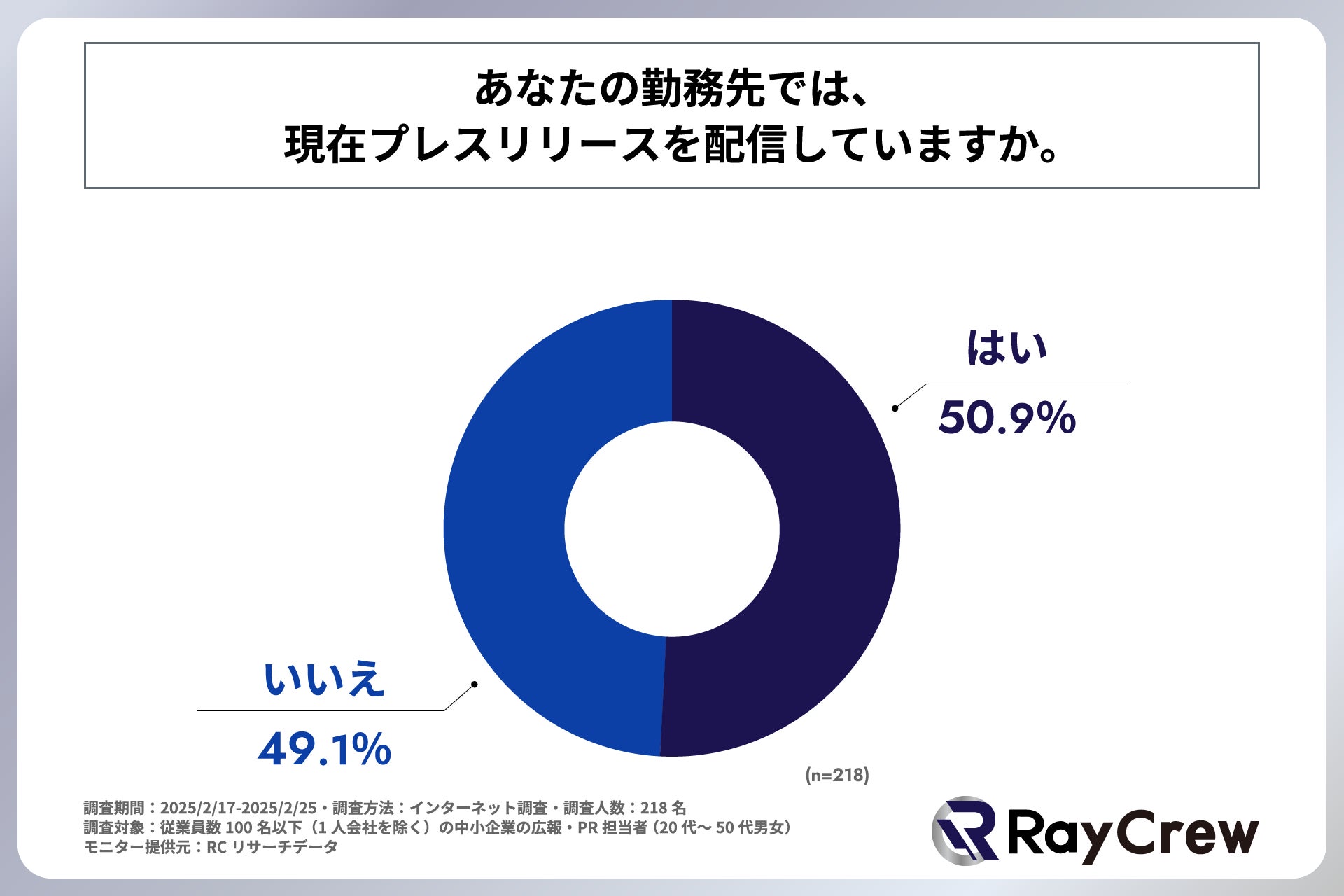 まず、「勤務先で、現在プレスリリースを配信しているか」を尋ねる設問への回答では、「はい」が50.9%、「いいえ」が49.1%という結果になりました。この結果から、従業員数100名以下の中小企業の約半数が、現在プレスリリースを配信している、ということが明らかになりました。