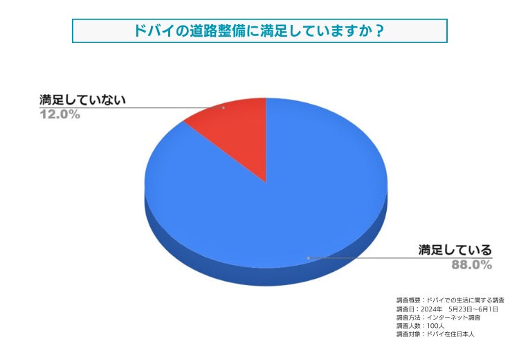 弊社が運営する『ドバイ総合研究所』は、ドバイ在住の日本人を対象に「ドバイの道路整備に対する満足度」についてアンケート調査を実施しました。結果は以下の通りです。