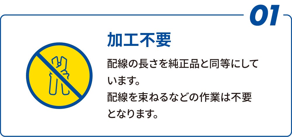 配線の長さを純正品と同等仕様に設定。 取り付け時に配線を束ねるなどの追加作業は不要です。 現場での作業効率向上に貢献します。