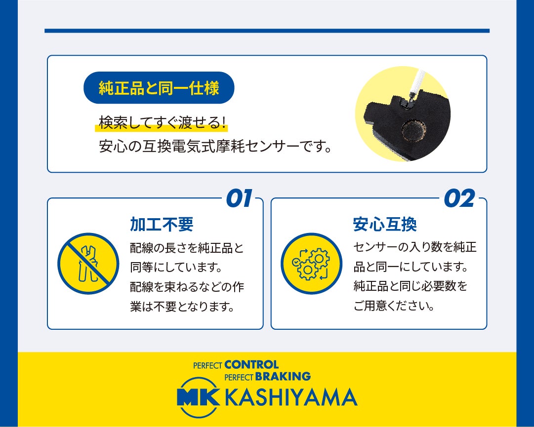 エムケーカシヤマ株式会社(本社:長野県佐久市、代表取締役社長:樫山剛士、以下「エムケーカシヤマ」)は、このたびキャンター用ブレーキパッド電子式摩耗センサー(5品番)を新発売いたしました。