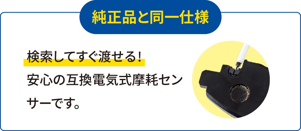 本製品は、純正品と同一仕様で設計した安心の互換電子式摩耗センサーです。整備現場での使いやすさと確実性を追求し、「検索してすぐ渡せる」ラインアップとして展開いたします。