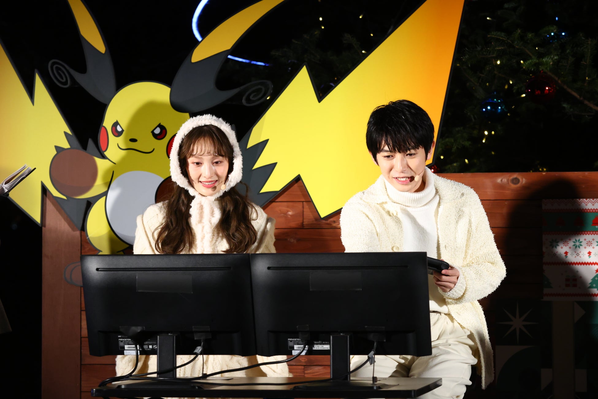 当日は、ゲストに本郷奏多さん、百田夏菜子さん、エルフの荒川さん・はるさんをお招きし、それぞれがポケモンをイメージした白い衣装に身を包み、クリスマスならではの思い出やポケモンにまつわるエピソードを披露いただきながら、ツリー点灯を行うスペシャルセレモニーを実施しました。点灯式には、サンタ姿のピカチュウも登場し、クリスマスにちなんだ特別感のある姿で会場を和ませました。また、ゲストのみなさんには『Pokémon LEGENDS Z-A』を実際にプレイしていただき、「Z-A Battle Club」による通信対戦でのバトルも体験いただきました。