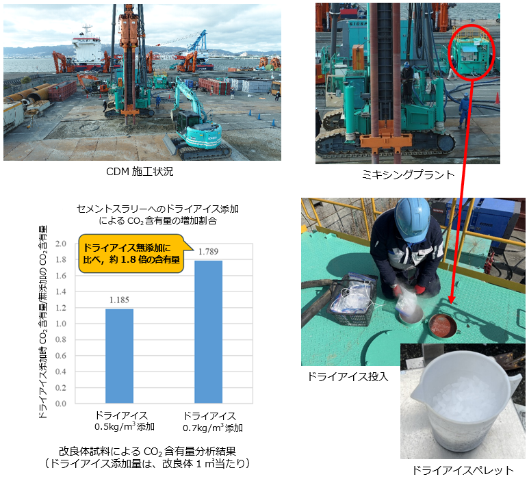 (ドライアイス混入量を変えたセメントスラリー改良体のCO2固定量の比較により施工時の適用性を確認)