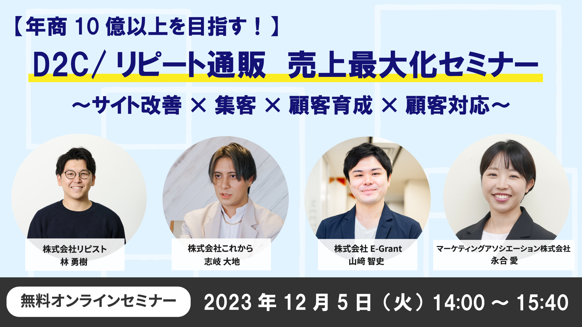 4社共催ウェブセミナー『【年商10億以上を目指す!】D2C/リピート通販 売上最大化セミナー ~サイト改善×集客×顧客育成×顧客対応~』を2023年12月5日に開催!